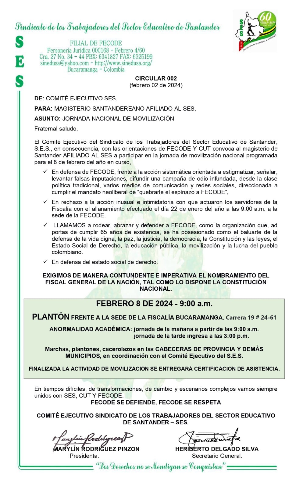 El Sindicato de Educadores de Santander (SES) informó que también estarán participando en el plantón que se va a realizar este jueves 8 de febrero en respaldo a Fecode.