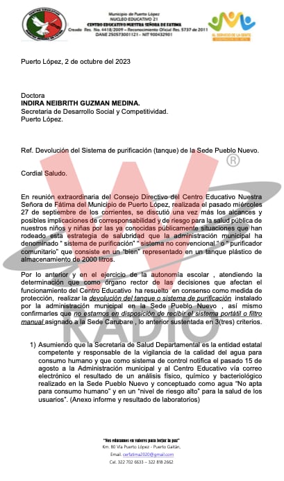 Incluso, tenemos una carta en la que el centro educativo de la señora de Fátima, decidió hacer la devolución del tanque, dejando muy claro que no están dispuestos a recibir otro sistema de purificación parecido hasta que la gobernación responda.