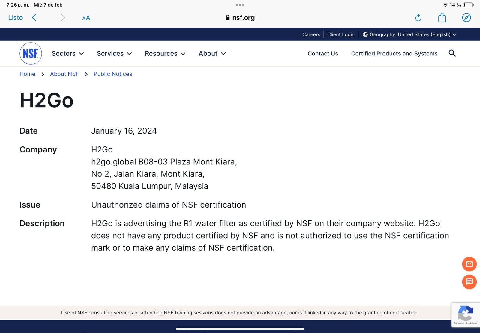 Es muy sencillo mirar si un producto es avalado por la NSF, en su página tienen un buscador. Allí, se escribe el nombre “H2Go” y automáticamente aparece que no están certificados y mucho menos autorizados a usar marcas con el sello de la compañía.