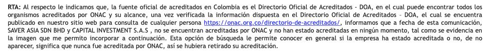 En el país, existe una entidad llamada Organismo Nacional de Acreditación de Colombia (ONAC) que se encarga de verificar que cualquier bien y servicio que se producen y circulan en el país cumplan con requisitos de seguridad y calidad contenidos en estándares internacionales. Al igual que la NSF, tienen un directorio y en ningún lado aparece la empresa asiática Saver Asia, ni Capital Investments.