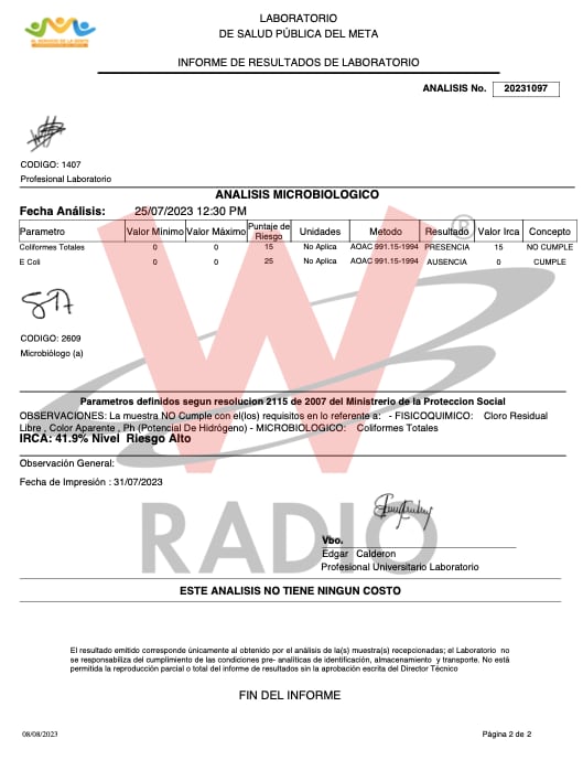 La W tiene en su poder estudios de la Secretaría de Salud del departamento del Meta en donde señalan que el agua de estos tanques purificadores, puntualmente de los centros educativos son alta y medianamente riesgosos.