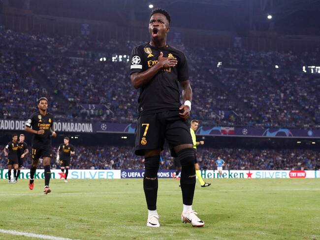 Vinicius Junior, del Real Madrid, celebra su gol contra Napoli por Champions. Foto: Helios de la Rubia/Real Madrid via Getty Images. / Helios de la Rubia