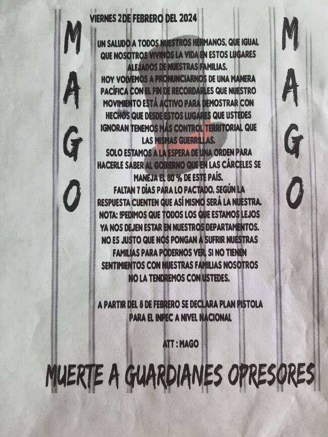 Y agregó “efectivamente desde la semana pasada del día sábado en horas de la noche arrojaron por debajo de la puerta principal unos panfletos de un grupo autodenominado “mago” con mensaje amenazante hacia los funcionarios del Inpec e igualmente el pasado miércoles en horas de la madruga también se recibieron otros panfletos, y a raíz pues de esta situación se convocó a un consejo de seguridad interno aquí en el establecimiento donde asistieron las diferentes autoridades del departamento y de la ciudad de Armenia Secretaría de Gobierno del interior de la Gobernación, Fiscalía también nos acompañó la UNP en ese consejo de seguridad y la Procuraduría y defensoría en fin tocamos pues ahí el tema de las amenazas y se tomaron unas decisiones y unas conclusiones”