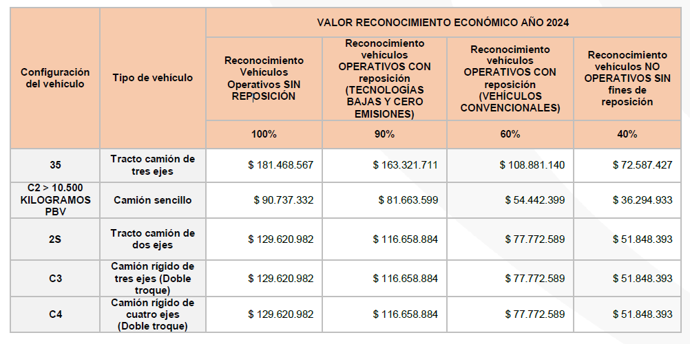 Al respecto es importante destacar que de acuerdo a la mencionada resolución, desde el 17 de enero de 2024, aplican los siguientes valores de reconocimiento económico por la desintegración física total de vehículos de servicio público de transporte terrestre automotor de carga: