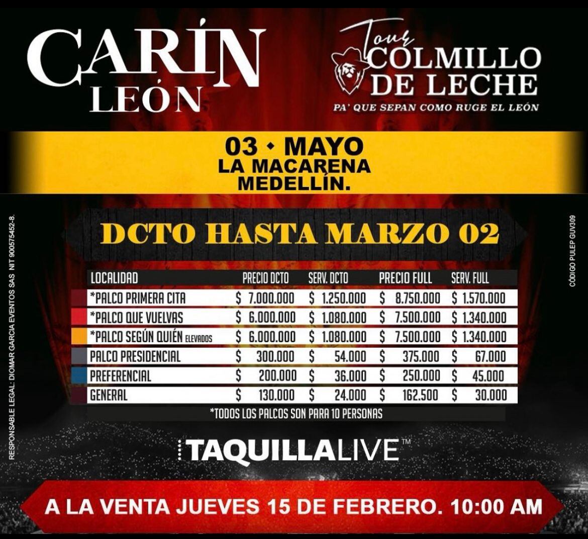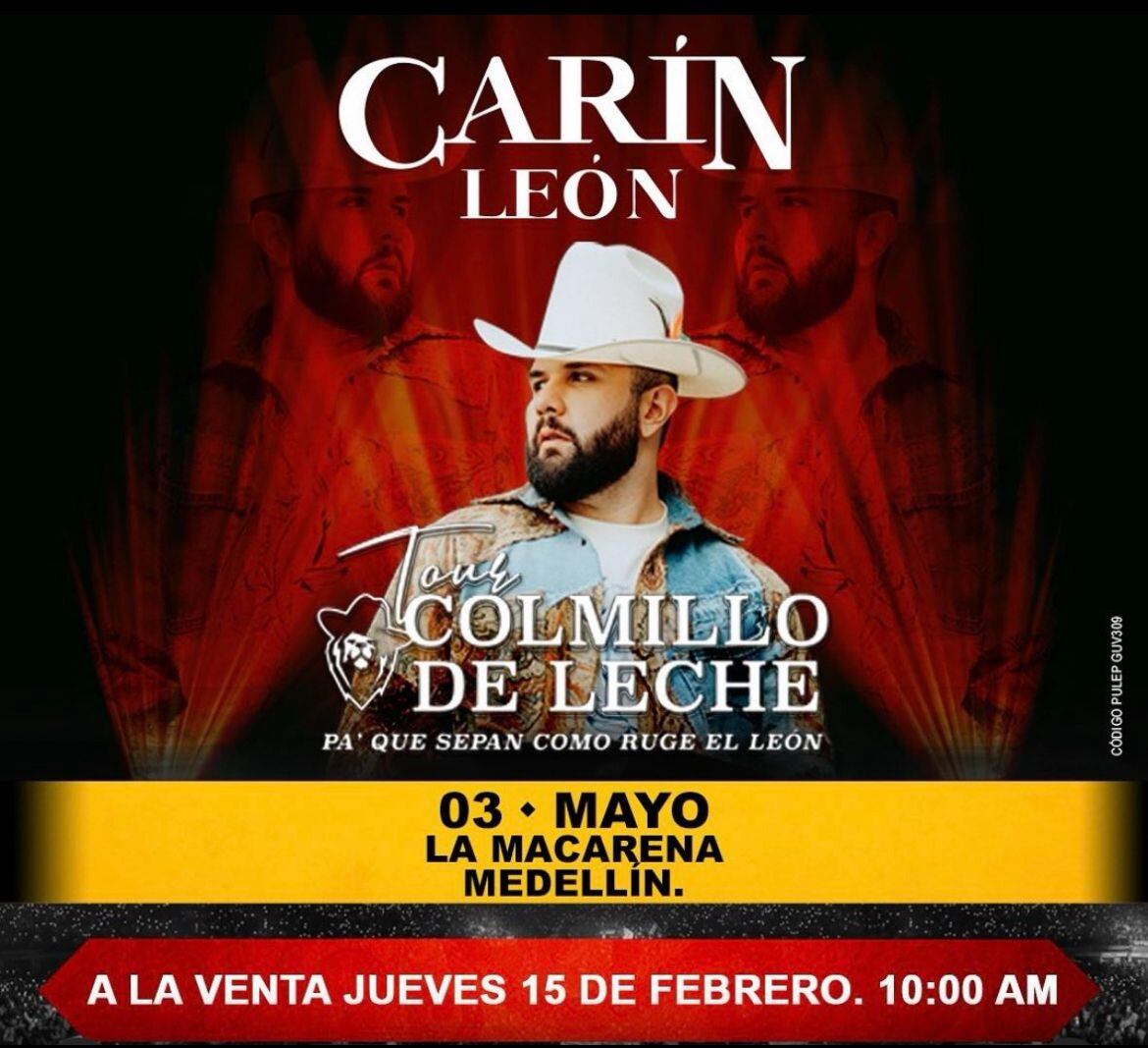 Carín ha colaborado con Camilo y también con Maluma en su famosa canción ‘Según Quién’. El artista de música regional mexicana estuvo por primera vez en Colombia el 3 de noviembre del año pasado en el Movistar Arena de Bogotá y fue todo un éxito. Se espera que esta vez sea igual en la capital antioqueña.