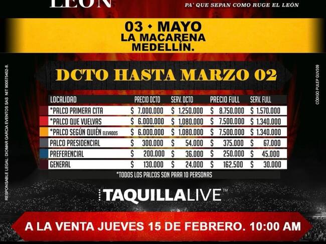 La venta de las entradas estará habilitadas en la página web de Taquilla Live a partir de este jueves a las 10 de la mañana. Las boletas tendrán un descuento especial hasta el 2 marzo y los precios, en esta primera venta, van desde 165 mil pesos en general hasta 8 millones 750 mil pesos para palcos.