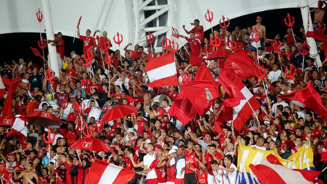 CALI, COLOMBIA - MARCH 03: Fans of America de Cali cheer for their team during a match between America de Cali and Bucaramanga as part of Torneo Postobon 2014 at Pascual Guerrero Stadium on March 03, 2014 in Cali, Colombia. (Photo by Juan Carlos Quintero/LatinContent via Getty Images) / LatinContent