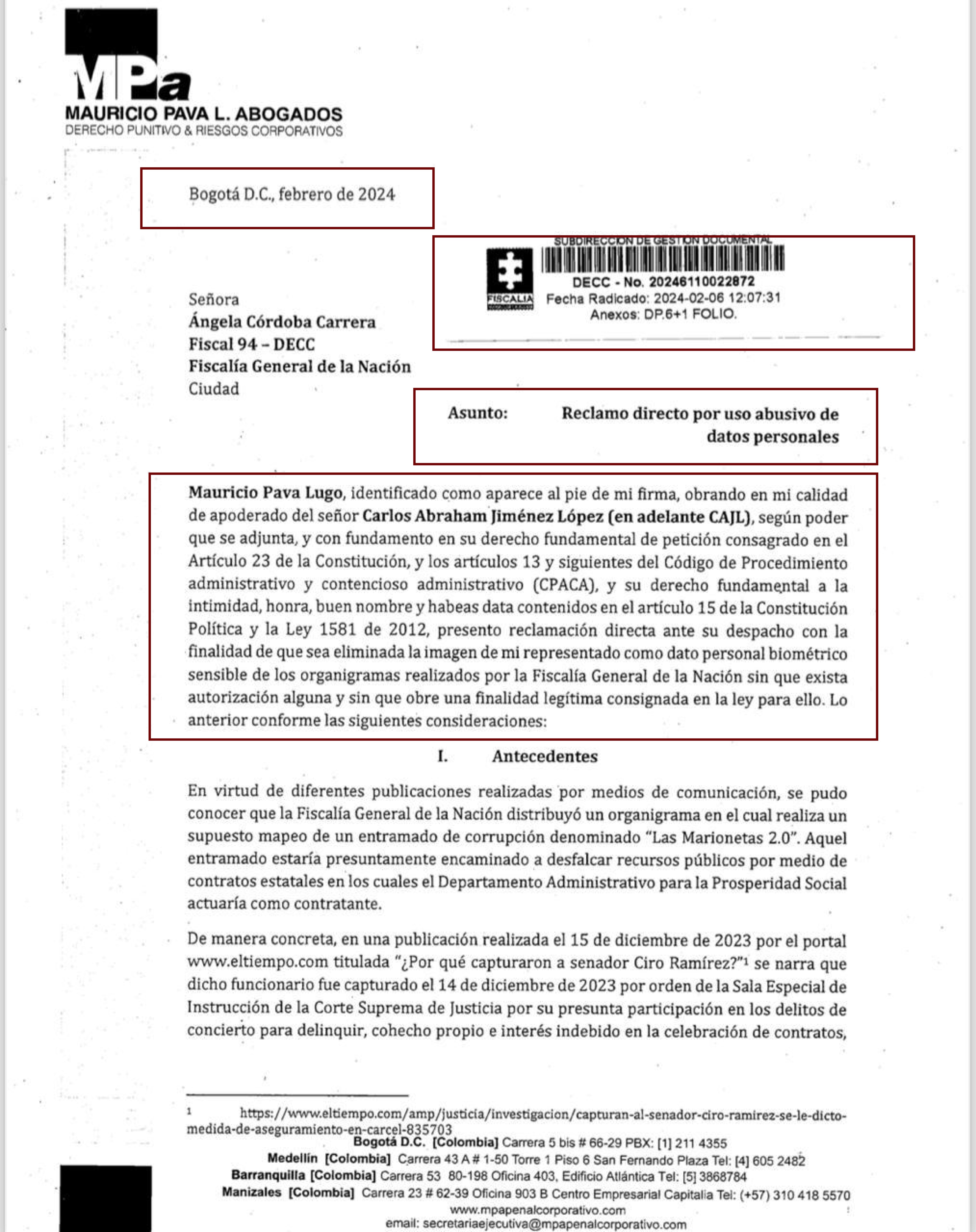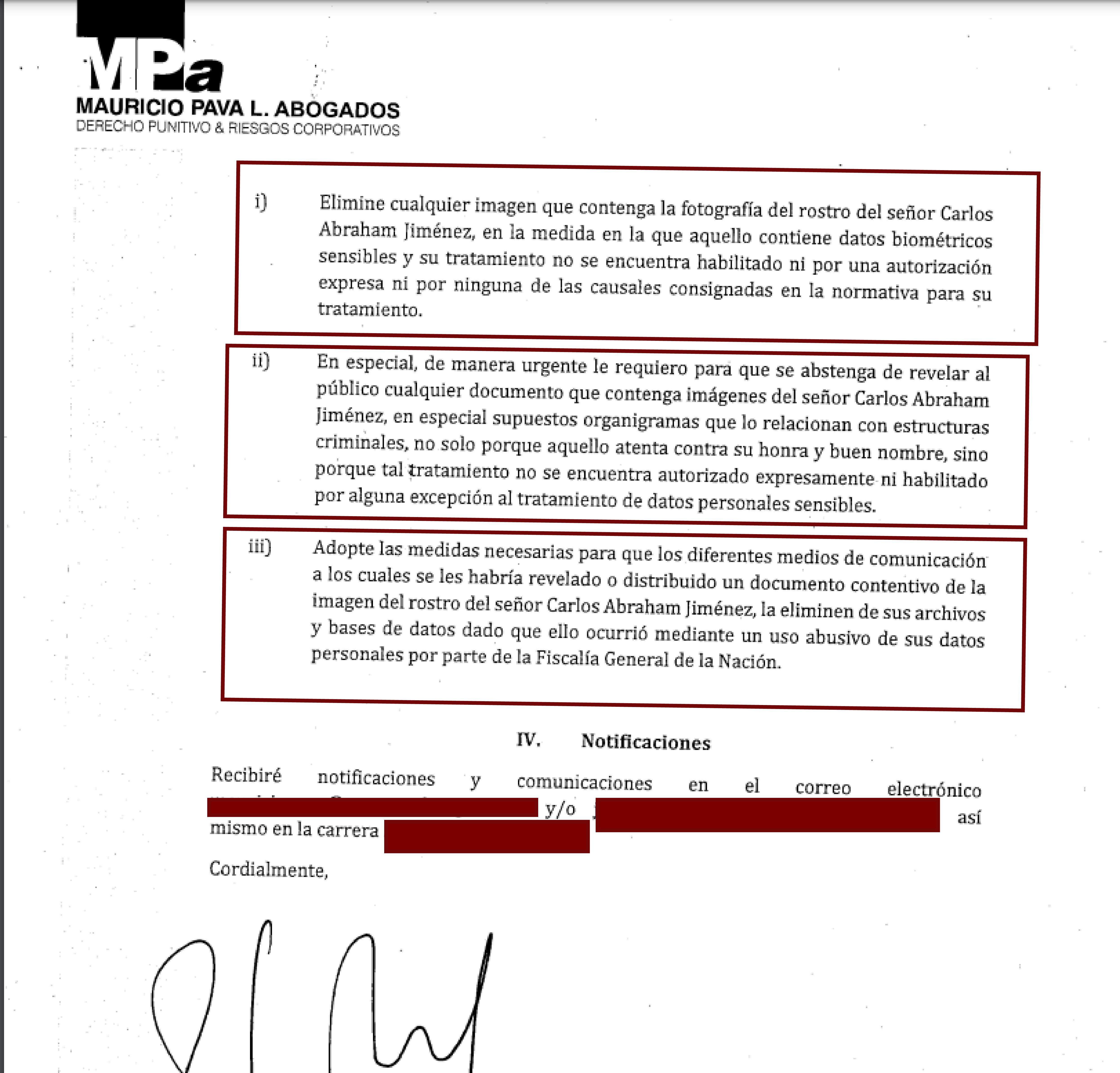También exige que se abstenga de revelar al público cualquier documento que contenga imágenes del senador, que lo relacionen con estructuras criminales porque atenta contra su derecho al buen nombre y porque él no autoriza que se utilicen sus datos personales.