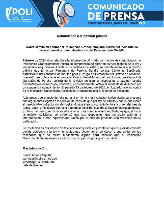 La Institución universitaria Politécnico Grancolombiano se refirió a la decisión del Juzgado Cuarto Penal Municipal con Función de Control de Garantías de Pereira el cual ordena cinco días de arresto y multa de diez salarios mínimos legales vigentes contra el rector como representante legal de la misma.