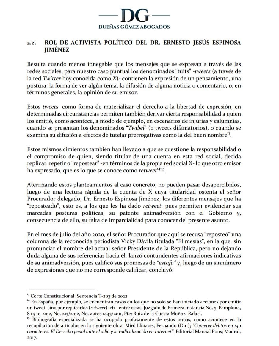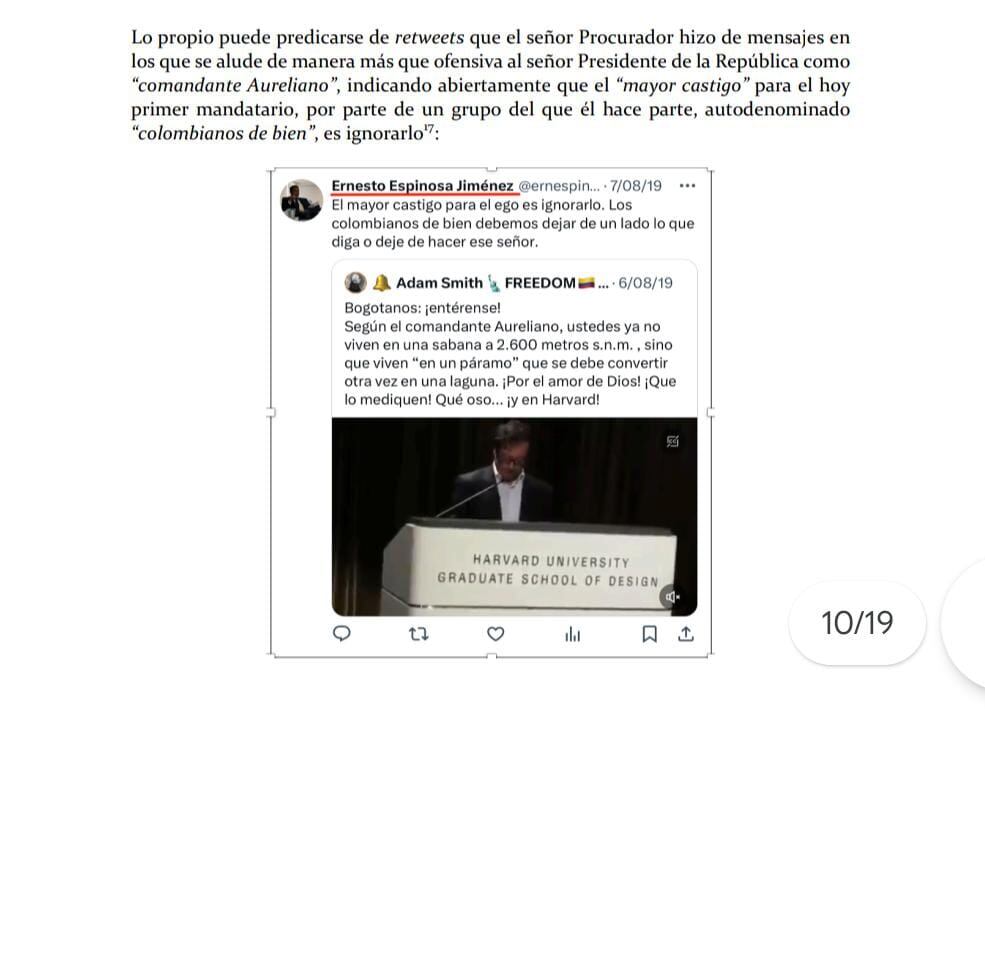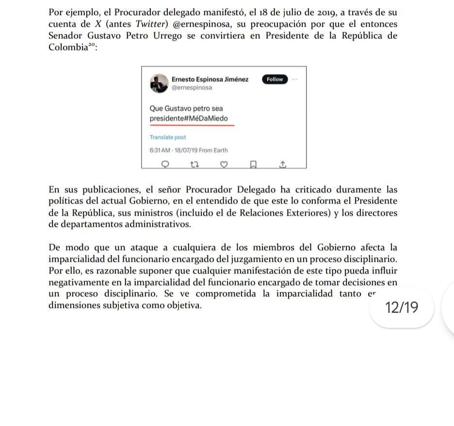 Sobre esto argumenta que el procurador a través de sus redes sociales hizo trinos en contra del Gobierno actual, por ejemplo, uno en el que dice: