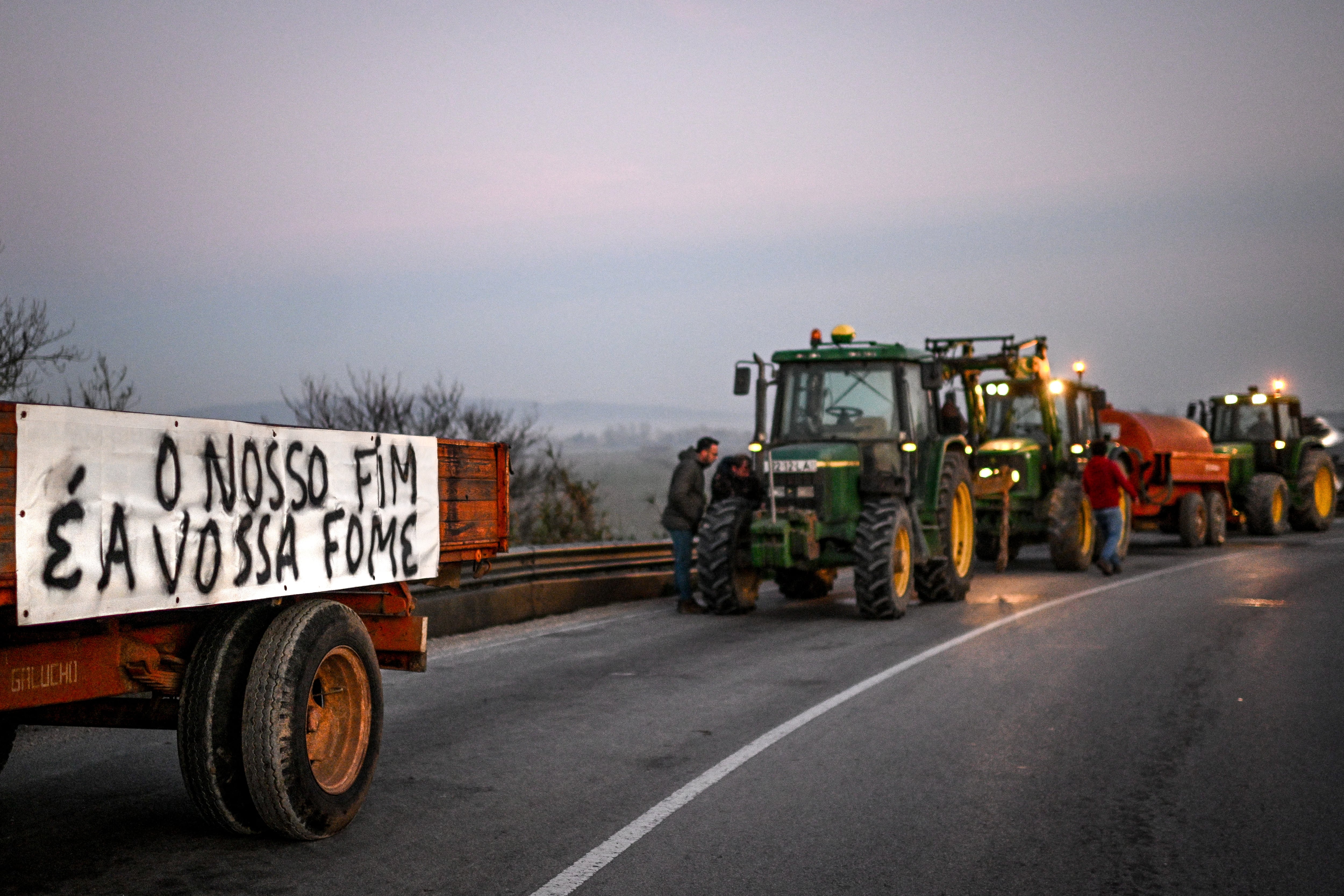 CORRECTION / A banner reading "Our end is your hunger" is seen on a tractor participating in a protest in demand of fair conditions for the agricultural sector, in Golega, 130 km from Lisbon, on February 1, 2024. The EU plans to extend tariff-free entry for Ukrainian farm products for a year from June, but with "safeguards" to stop cheaper imports flooding the market at the expense of Europe's own farmers. Grain imports from war-torn Ukraine have already caused a standoff with Poland and become a major source of anger for farmers in several EU countries, staging roadblocks to demand better revenues and conditions. (Photo by PATRICIA DE MELO MOREIRA / AFP) / "The erroneous date appearing in the metadata of this photo by PATRICIA DE MELO MOREIRA has been modified in AFP systems in the following manner: [February 1, 2024] instead of [January 30, 2023]. Please immediately remove the erroneous mention[s] from all your online services and delete it (them) from your servers. If you have been authorized by AFP to distribute it (them) to third parties, please ensure that the same actions are carried out by them. Failure to promptly comply with these instructions will entail liability on your part for any continued or post notification usage. Therefore we thank you very much for all your attention and prompt action. We are sorry for the inconvenience this notification may cause and remain at your disposal for any further information you may require." (Photo by PATRICIA DE MELO MOREIRA/AFP via Getty Images) / PATRICIA DE MELO MOREIRA