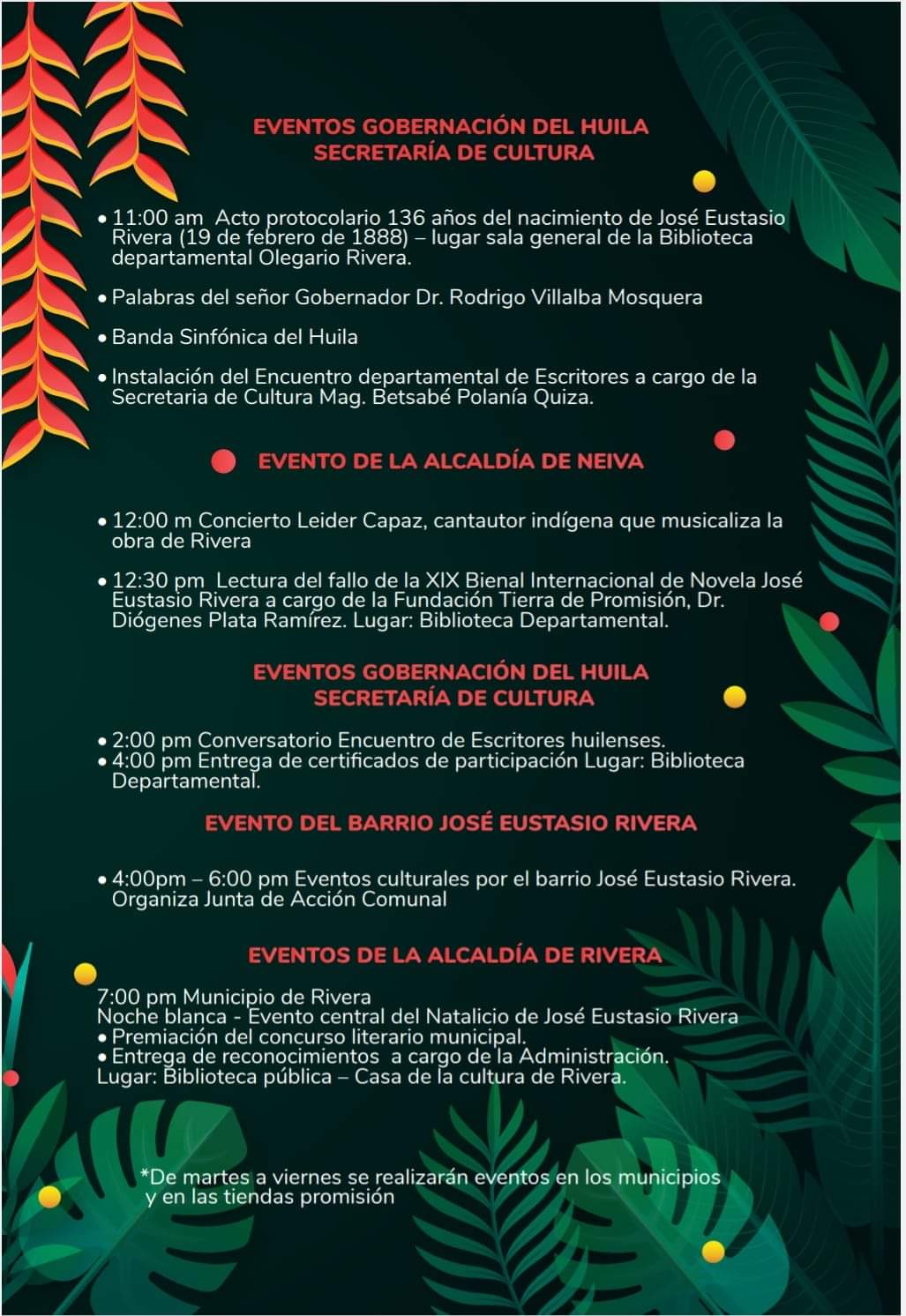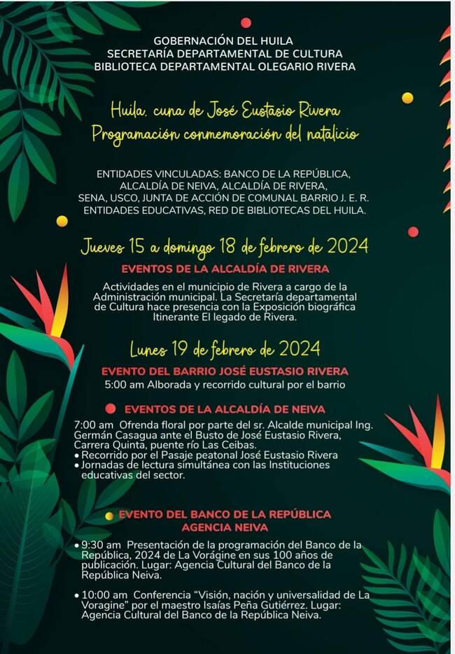 Para los riverenses, visitantes e invitados se ha construido una agenda de actividades como charlas, concurso de poesía, lanzamiento del álbum en honor a los poemas de José Eustasio, talleres artísticos, teatro, feria de emprendimiento, entre otra programación, la cual está dirigida para niños, jóvenes y adultos. Aquí les dejamos la fecha, hora y lugar de cada actividad: