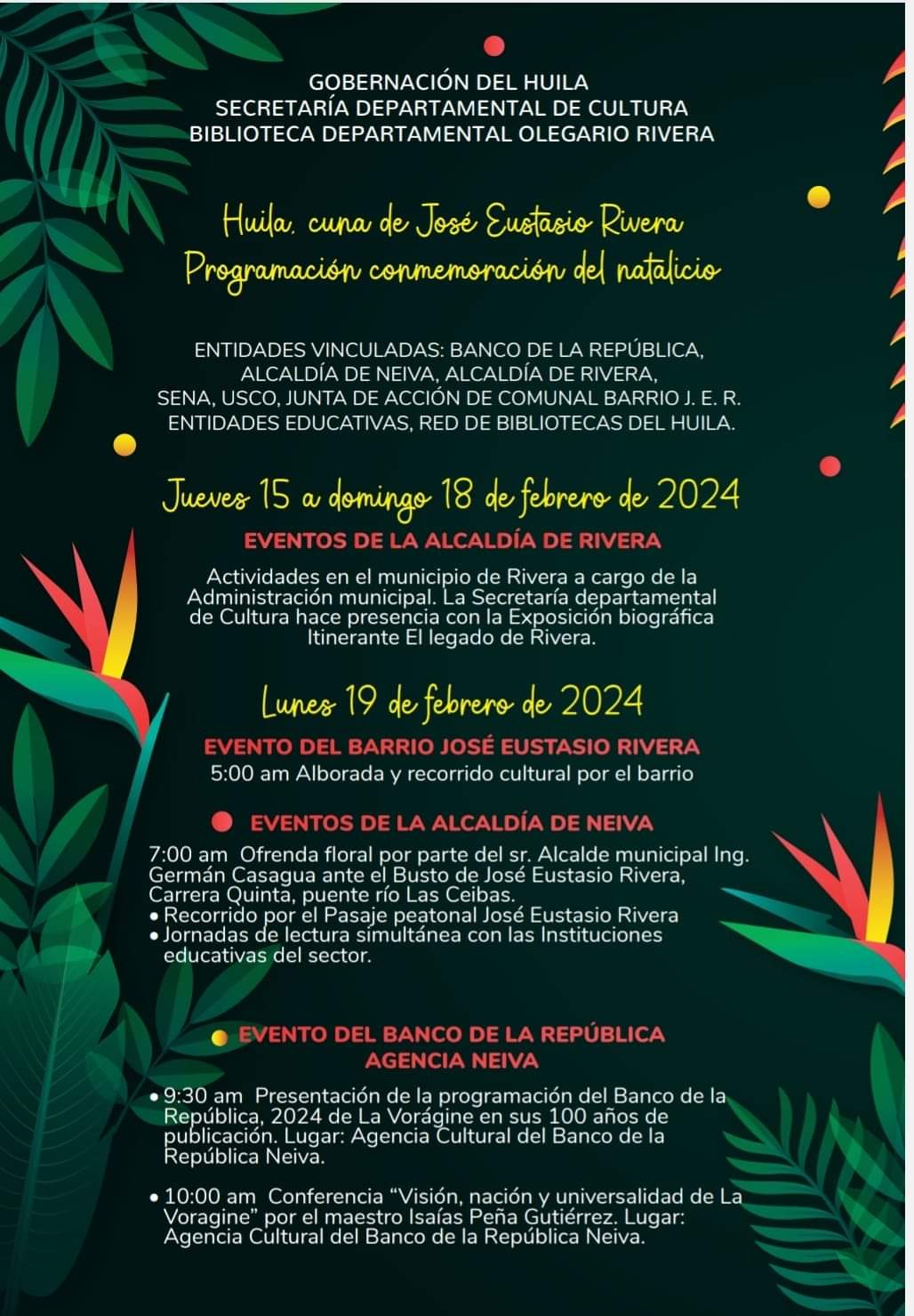 El departamento del Huila celebra el día de hoy el natalicio del escritor de la Obra La Voragine José Eustasio Rivera, se tiene programado diferentes actividades culturales conmemorando esta fecha.