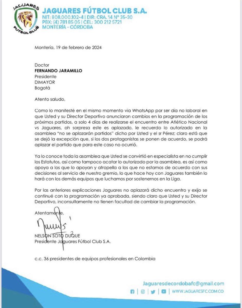 Carta de Nelson Soto, presidente de Jaguares, a Fernando Jaramillo, presidente de la Dimayor