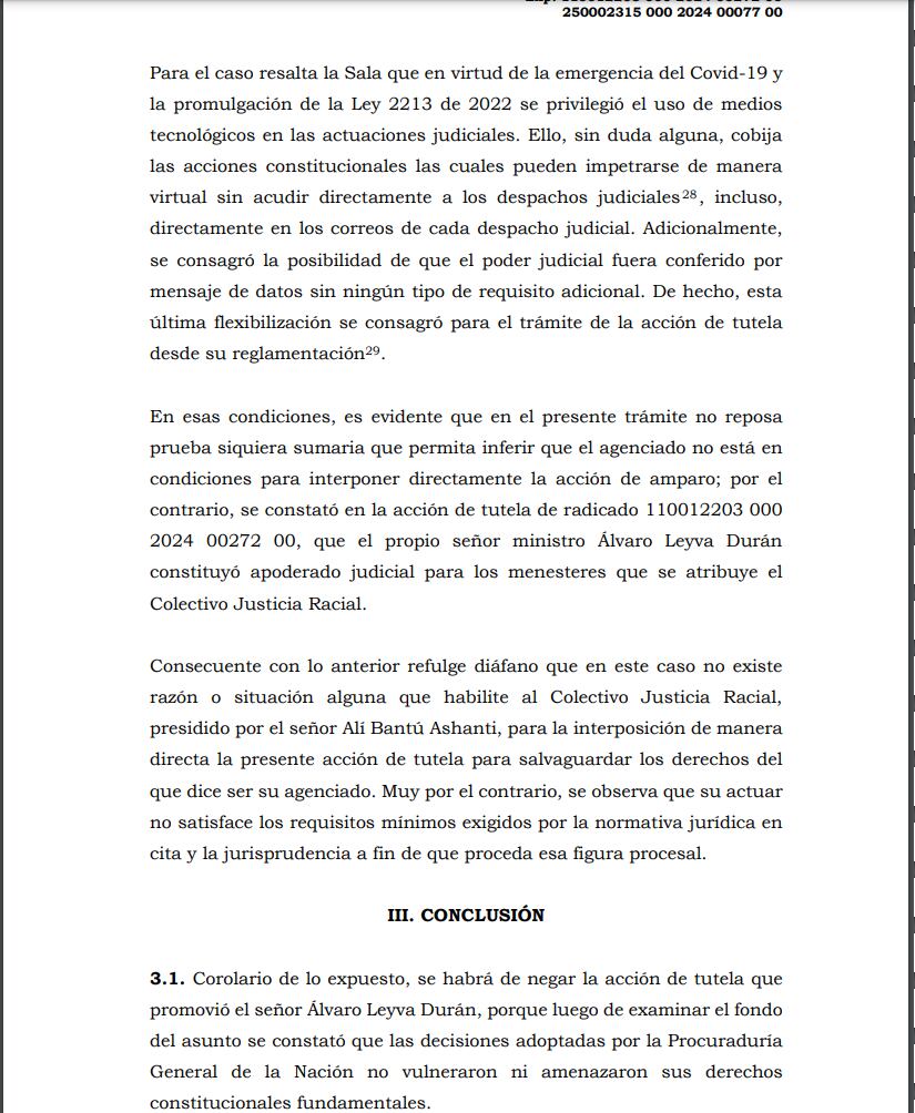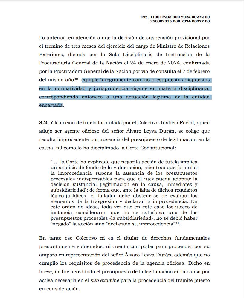 Para los magistrados, las decisiones adoptadas por la Procuraduría no vulneraron ni amenazaron los derechos del suspendido canciller Álvaro Leyva, dice el Tribunal Superior de Bogotá.