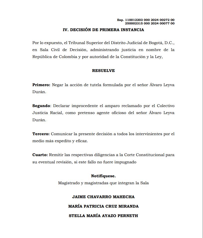 En firme se mantiene la suspensión de tres meses que le impuso la Procuraduría al canciller Álvaro Leyva, por el caso de irregularidades en la licitación de los pasaportes, luego que, la Sala Civil del Tribunal Superior de Bogotá negó por improcedente la tutela con la que buscaban tumbar esa sanción.