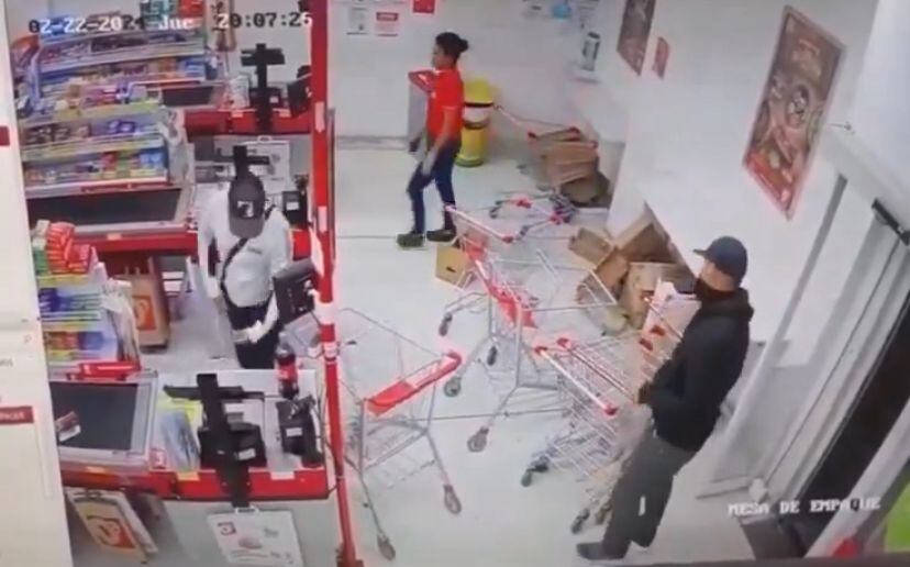 Los dos sujetos llegaron al lugar con tapabocas y gorras. Debajo de sus sacos, al aparecer, portan armas de fuego, intimidaron a los cajeros y proceden a saquear el lugar.