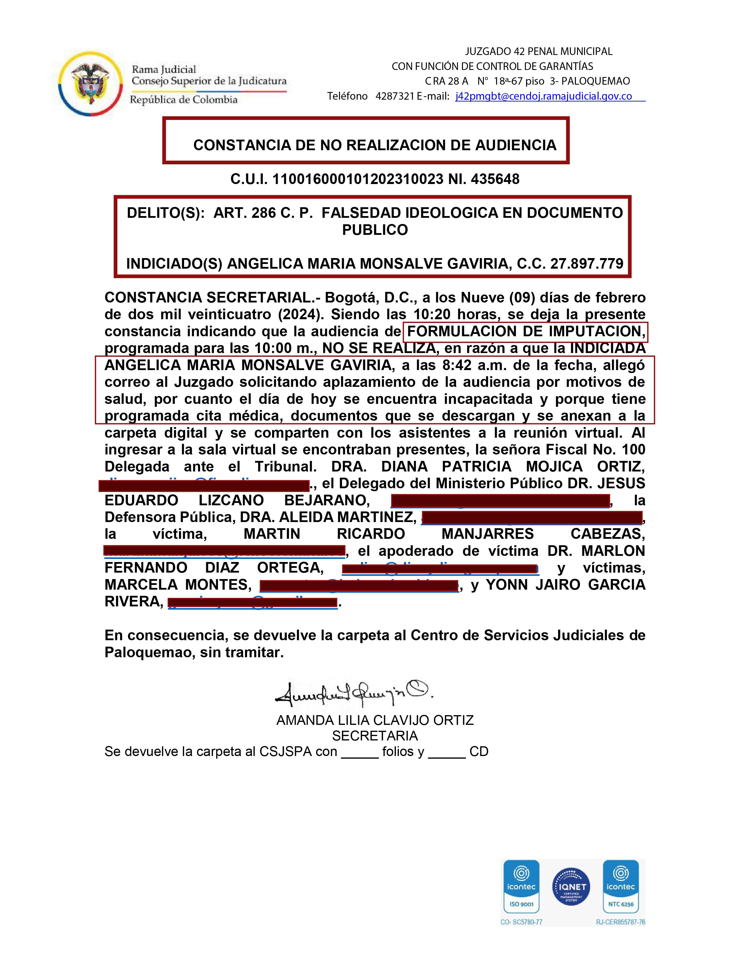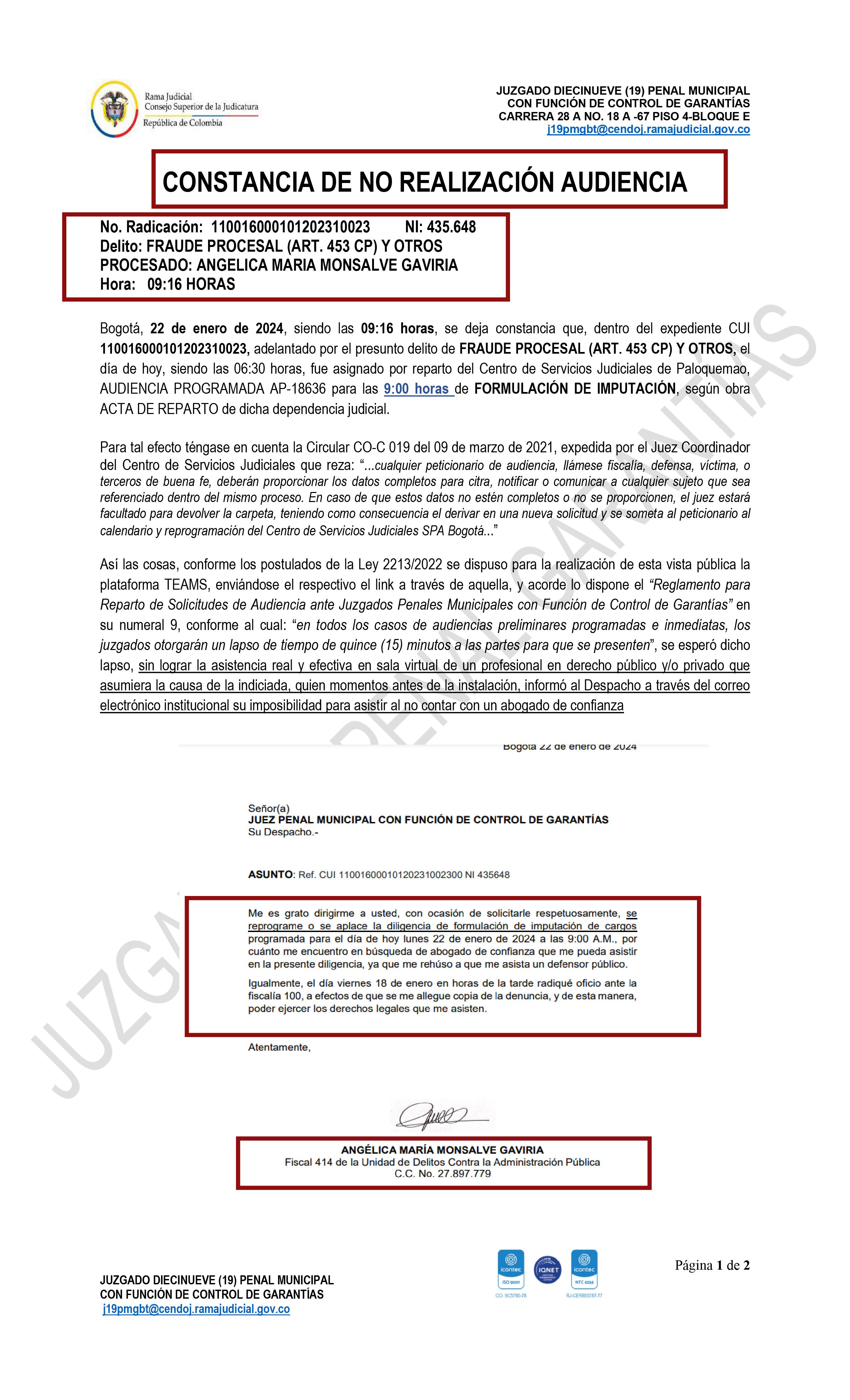 A la Fiscalía y a la representación de víctimas les llamó la atención que la fiscal Angélica Monsalve y su agente del CTI, de manera recurrente y coincidente tienen citas médicas justo a la misma hora en que deben comparecer a la audiencia de imputación de cargos en su contra.