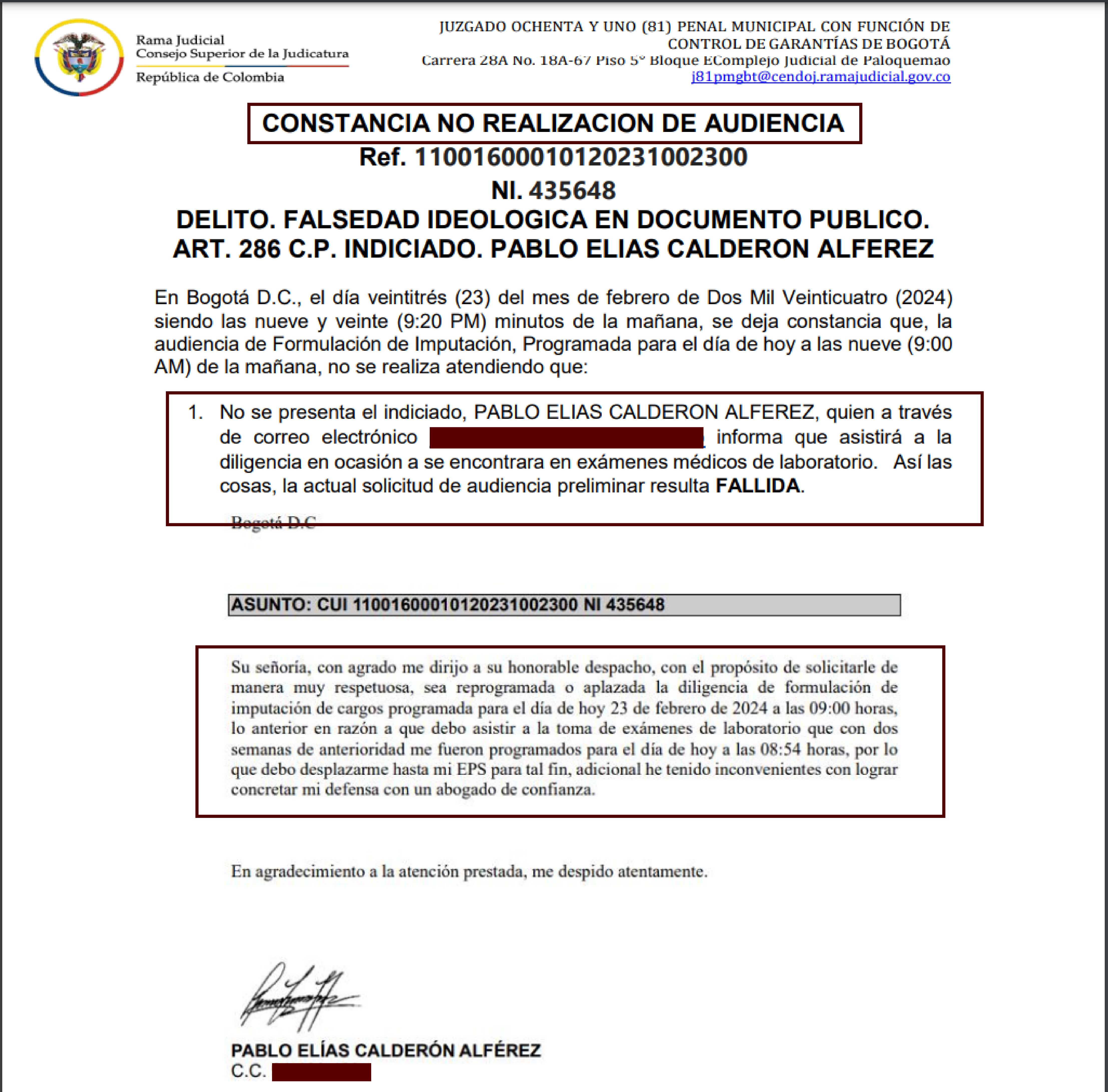 Ayer estaba prevista la audiencia en contra del investigador del CTI, Pablo Elías Calderón, la imputación estaba citada a las 9:00 am, pero no se llevó a cabo porque justo a la misma hora, el procesado dijo que tenía un examen de laboratorio clínico.
