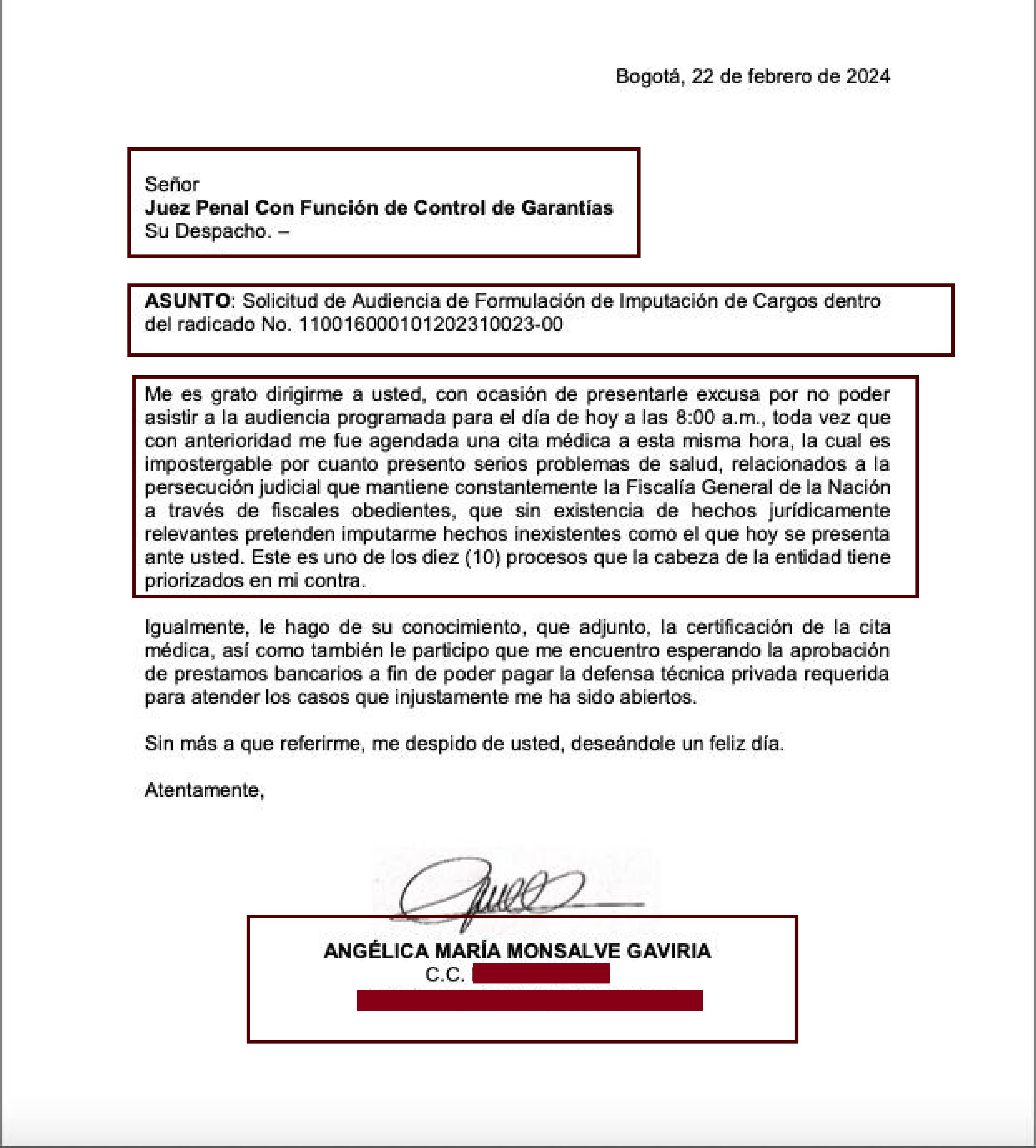 Y el pasado 22 de febrero de nuevo por cita médica programada a la misma hora de la audiencia (8:00 am). Alegó que era impostergable porque padece de “serios problemas de salud relacionados con una persecución judicial”.