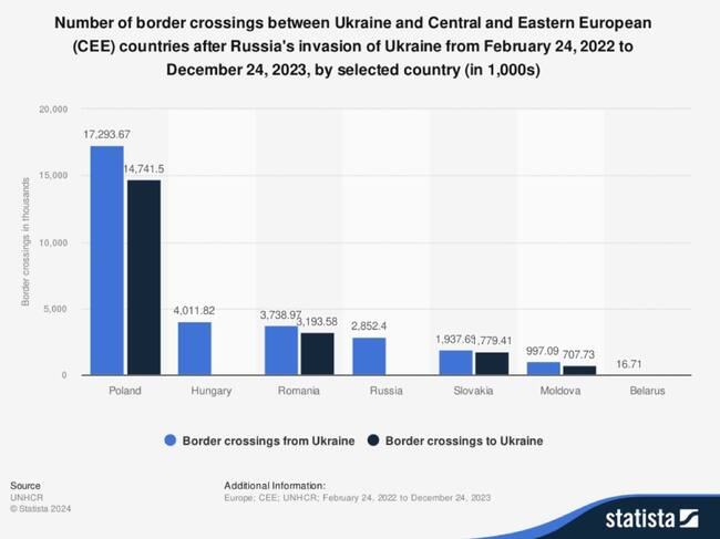 Según el portal de Datos Statista, el país que tiene el mayor número de cruces fronterizos, entre Ucrania y Europa central y oriental, es Polonia, el cual ha recibido a 17.293 personas a corte del 24 de diciembre de 2024.
