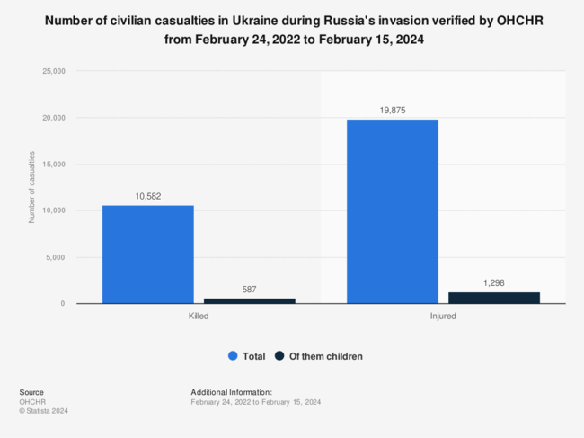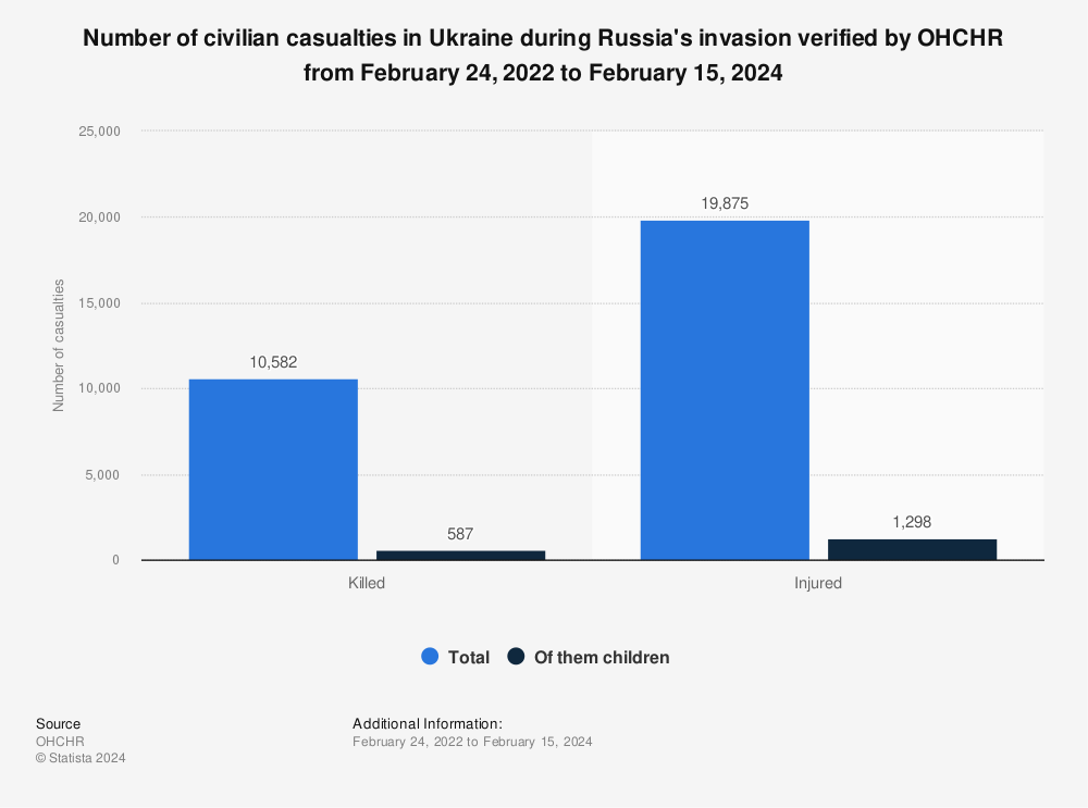 Además, el reporte más actual de esta casa de datos, con información de la Oficina de Derechos Humanos de Naciones Unidas, señala que, hasta el 15 de febrero de 2024, han fallecido 10.582 personas en territorio ucraniano desde que Rusia invadió el territorio. 19,875 personas han sido arrestadas.