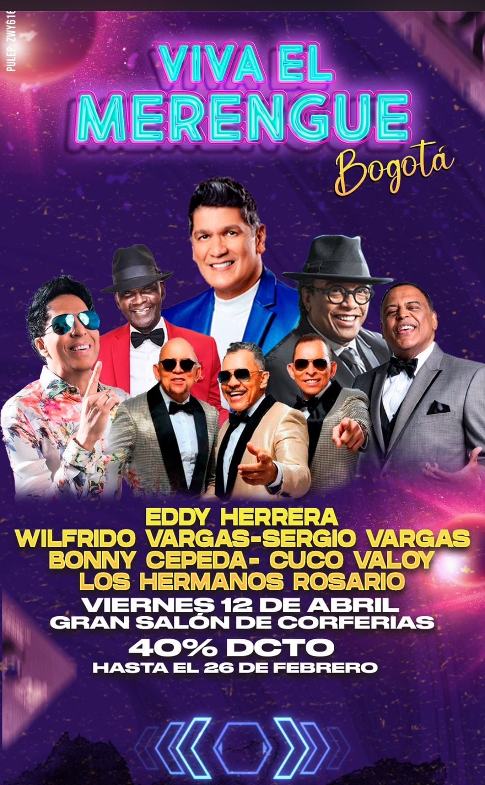 El 12 de abril las puertas de El Gran Salón de Corferias recibirán uno de los grandes eventos del año. Regresa “Viva el Merengue”, con una nómina de lujo; El ícono del merengue Eddy Herrera, Los Hermanos Rosario con todos sus éxitos, el artista dominicano Bonny Cepeda, El Negrito de la Villa, Sergio Vargas y el papá del merengue el gran Wilfrido Vargas y como invitado especial el cantante dominicano Cuco Valoy.
