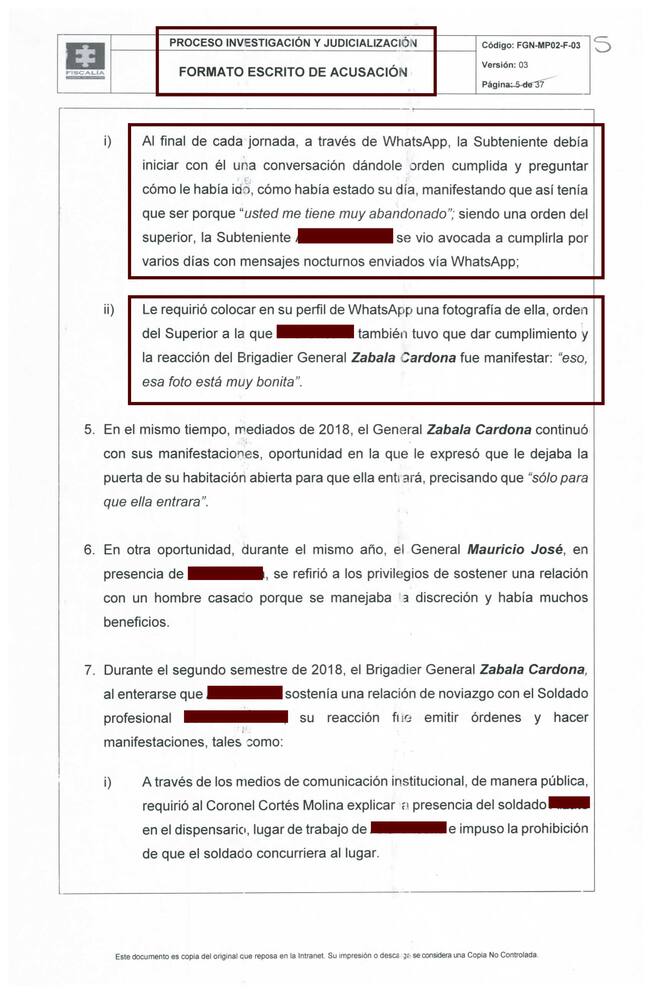 Entre los actos de presunto acoso, dice la Fiscalía que el general ordenó que al final de cada jornada la Subteniente debía reportarse vía WhatsApp y preguntar cómo le había ido y cómo había estado su día. Esa orden tuvo que cumplirla por varios días.