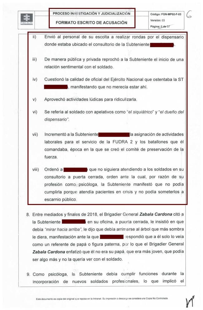 En es mismo año, 2018, dice la Fiscalía que el entonces general (r) Zabala, presuntamente acoso a la archivista del Batallón.