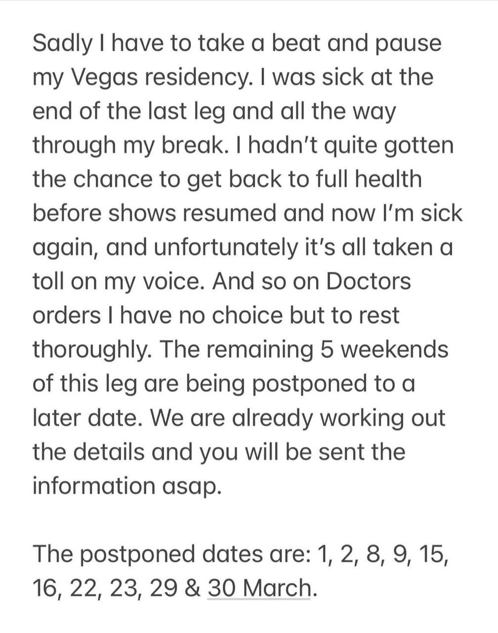 La cantante explicó: “estuve enferma al final del último tramo (de conciertos en Las Vegas) y durante todo el descanso. No había tenido la oportunidad de recuperarme completamente antes de que se reanudaran los espectáculos”.