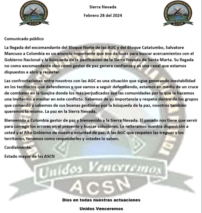 A través de un comunicado, las Autodefensas de la Sierra Nevada confirman apoyo a Salvatore Mancuso y le piden su intervención para iniciar un proceso de paz con el gobierno de Gustavo Petro