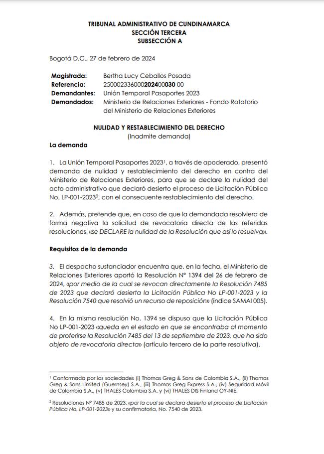 La Sección Tercera del Tribunal Administrativo de Cundinamarca inadmitió la demanda que interpuso la Unión Temporal Pasaportes 2023 y con la que pretendía que se anulara el acto administrativo que declaró desierto el proceso licitatorio de los pasaportes.