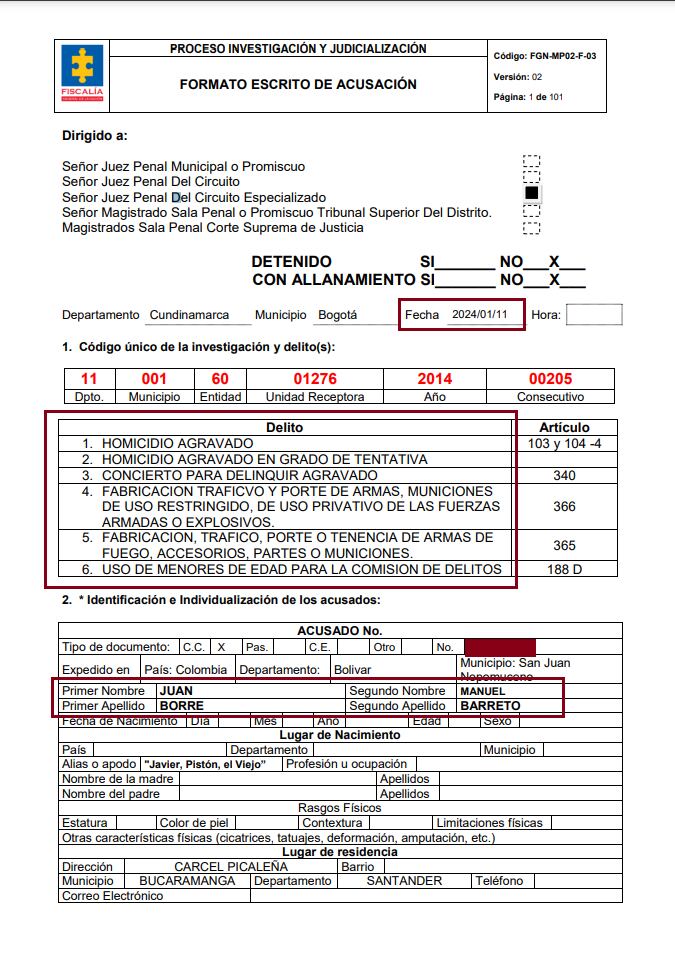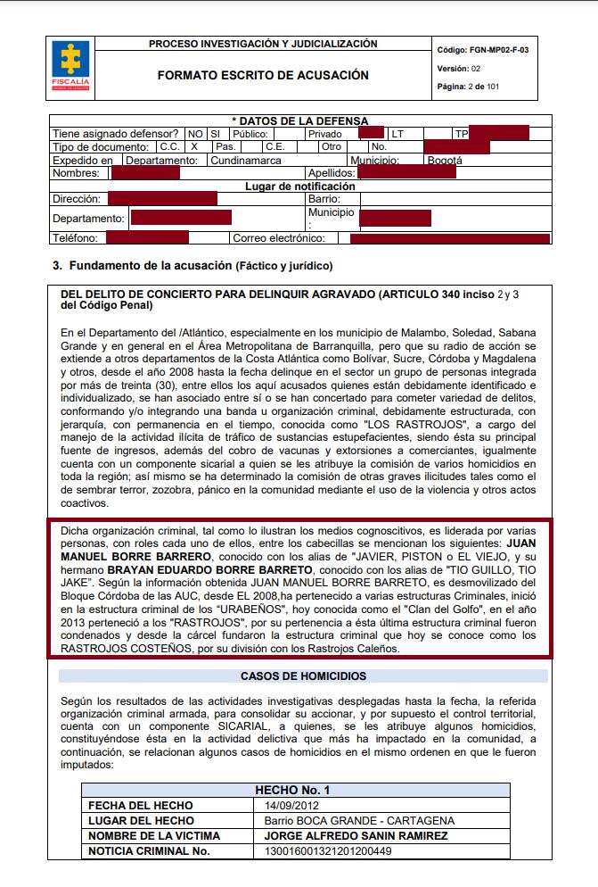 Una fiscal Especializada contra las organizaciones criminales radicó el escrito de acusación en contra de Juan Manuel Borre Barreto, alias “Pistón” o alias “Javier”, y Brayan Eduardo Borre Barreto, alias “Tío Guillo” o alias “Tío Yaqui”, dos de los señalados jefes de la banda de ‘Los Rastrojos’