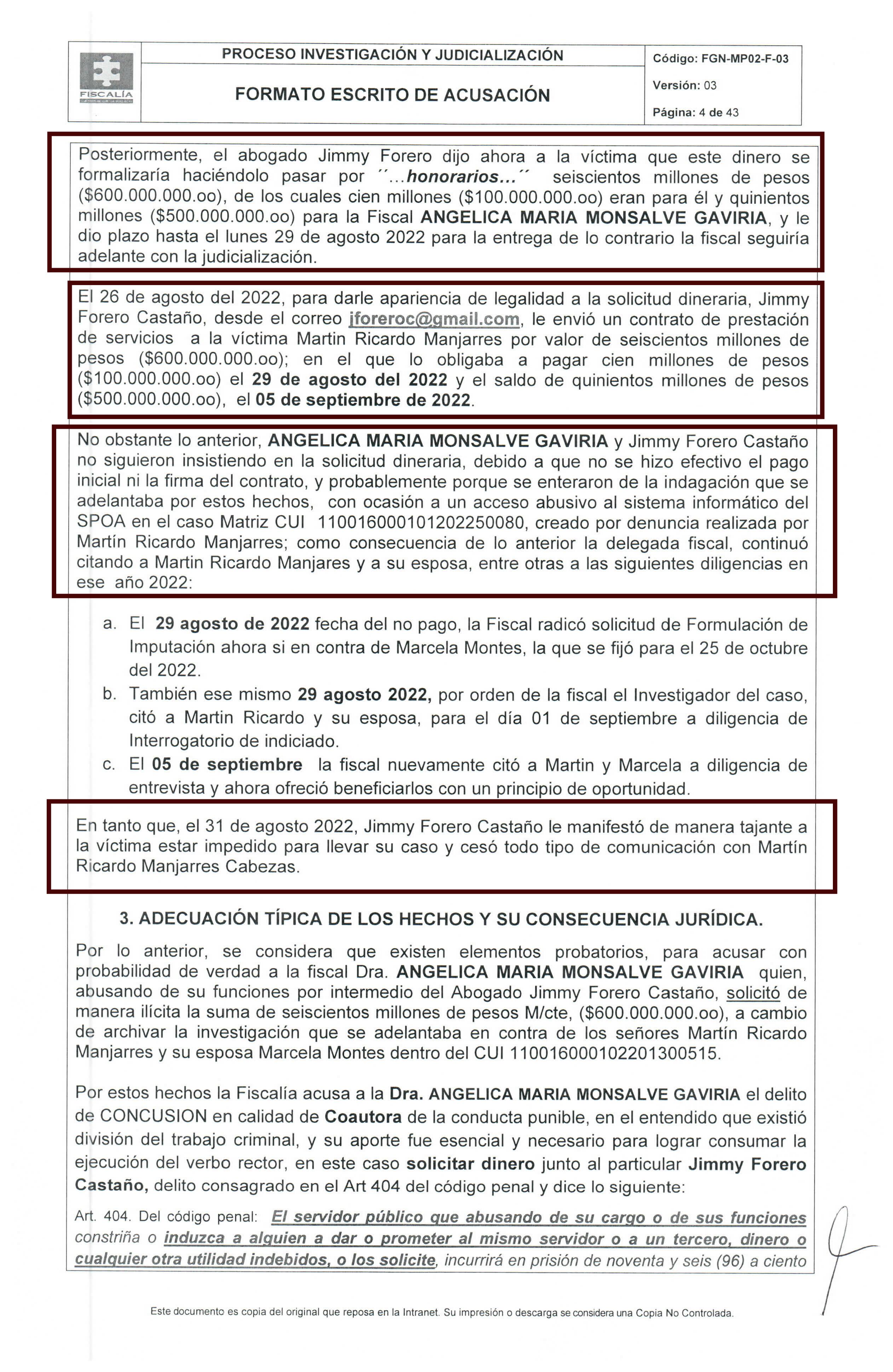 “de lo contrario la fiscal lo judicializaba ya no solo a él, sino también a su esposa Marcela Montes; para presionar el pago, Jimmy Forero en presencia de la víctima volvió a llamar en altavoz a la fiscal Angélica Monsalve. Posteriormente el abogado Jimmy Forero le dijo a la víctima que ese dinero se formalizaría haciéndolo pasar como “honorarios”.