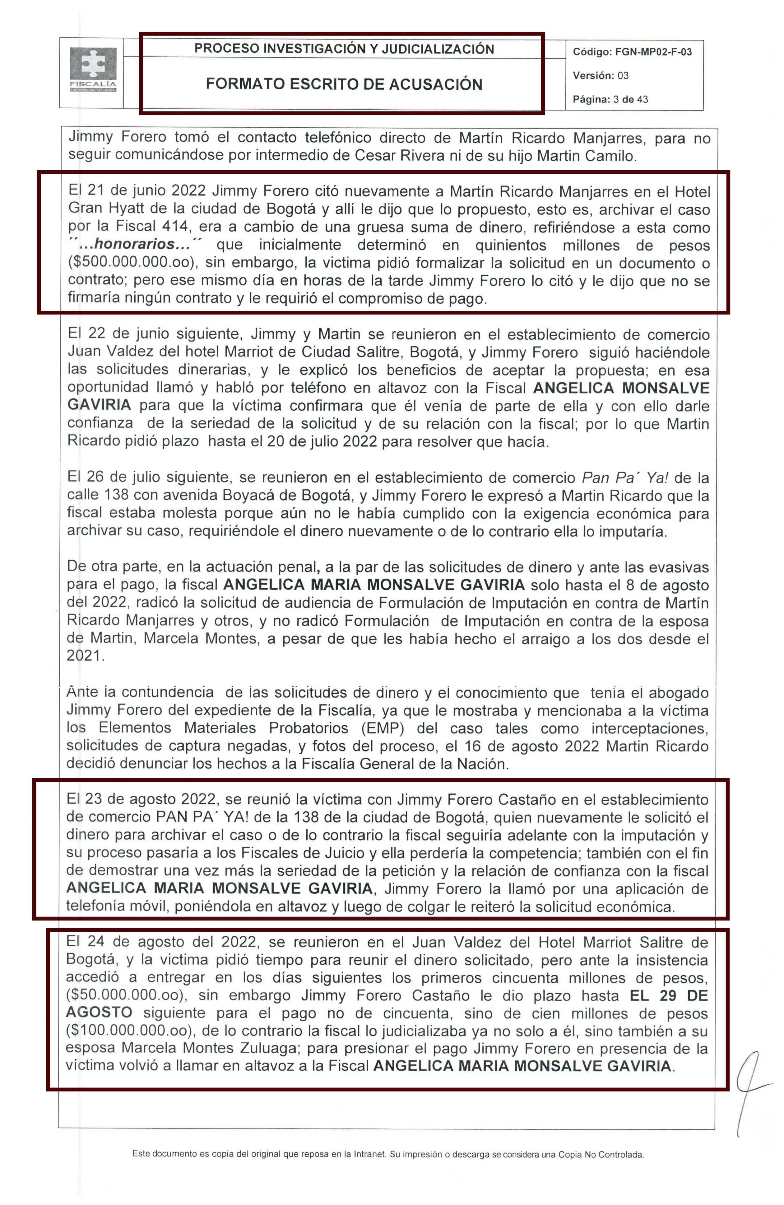 “Le dijo que venía de parte de la fiscal Angélica Monsalve, manifestó ser su amigo y compañero de la especialización, que ella le mandaba a hacer el ofrecimiento de ayudarle para que solucionaran su problema respecto del proceso en su contra, además, Jimmy Forero tomó contacto telefónico directo de Martín Manjarres, para no seguir comunicándose a través de Cesar Rivera ni de su hijo Martín Camilo”, se lee en la acusación.