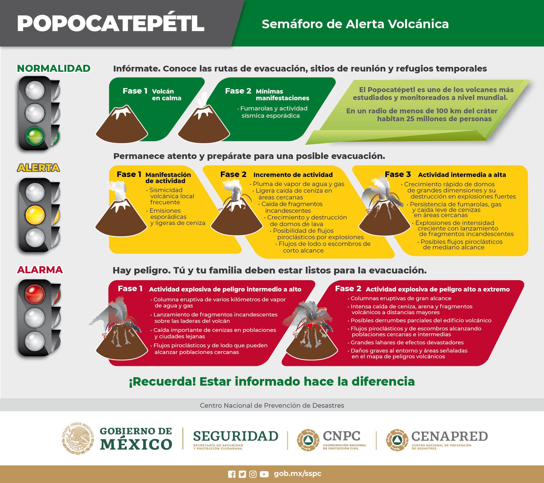 Protección Civil federal decidió mantener la alerta a la población en su nivel de Amarillo fase 2, pero ha advertido de la caída del material volcánico en los tres estados centrales que abarca el coloso, Morelos, Puebla y Estado de México, además de algunos sectores de la capital.