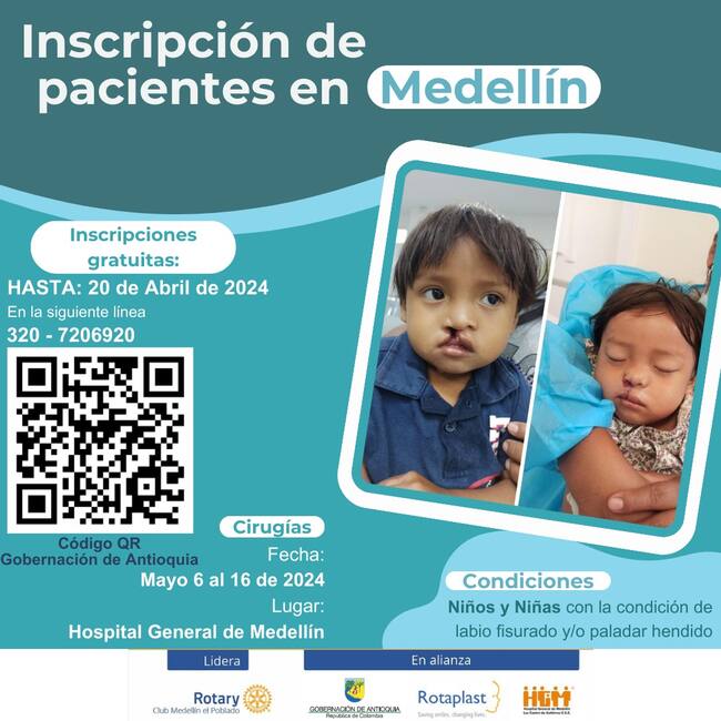 Por medio de la operación 100 sonrisas, en alianza con El Club Rotario, la Secretaría de Salud de la Gobernación de Antioquia y Rotoplast, se realizarán 100 operaciones gratuitas a niños con labio leporino en el Hospital General de Medellín.