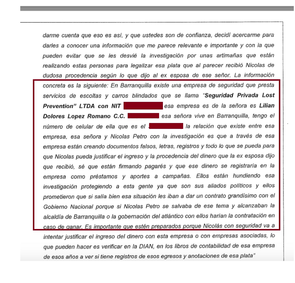 Esa fuente “anónima” le dijo a la Fiscalía que Nicolas Petro, estaba haciendo gestiones con la compañía de vigilancia Lost Prevention, supuestamente “para crear documentos falsos, letras y todo lo que se pueda para que Nicolás pudiera justificar la procedencia y la procedencia del dinero que la exesposa dijo que recibió, sé que están firmando pagarés y que ese dinero se registra en la empresa como préstamos y aportes a campañas. Ellos (Lost Prevention) están hundiendo esa investigación protegiendo a esta gente que son sus aliados políticos”, se lee en el documento de la Fiscalía.