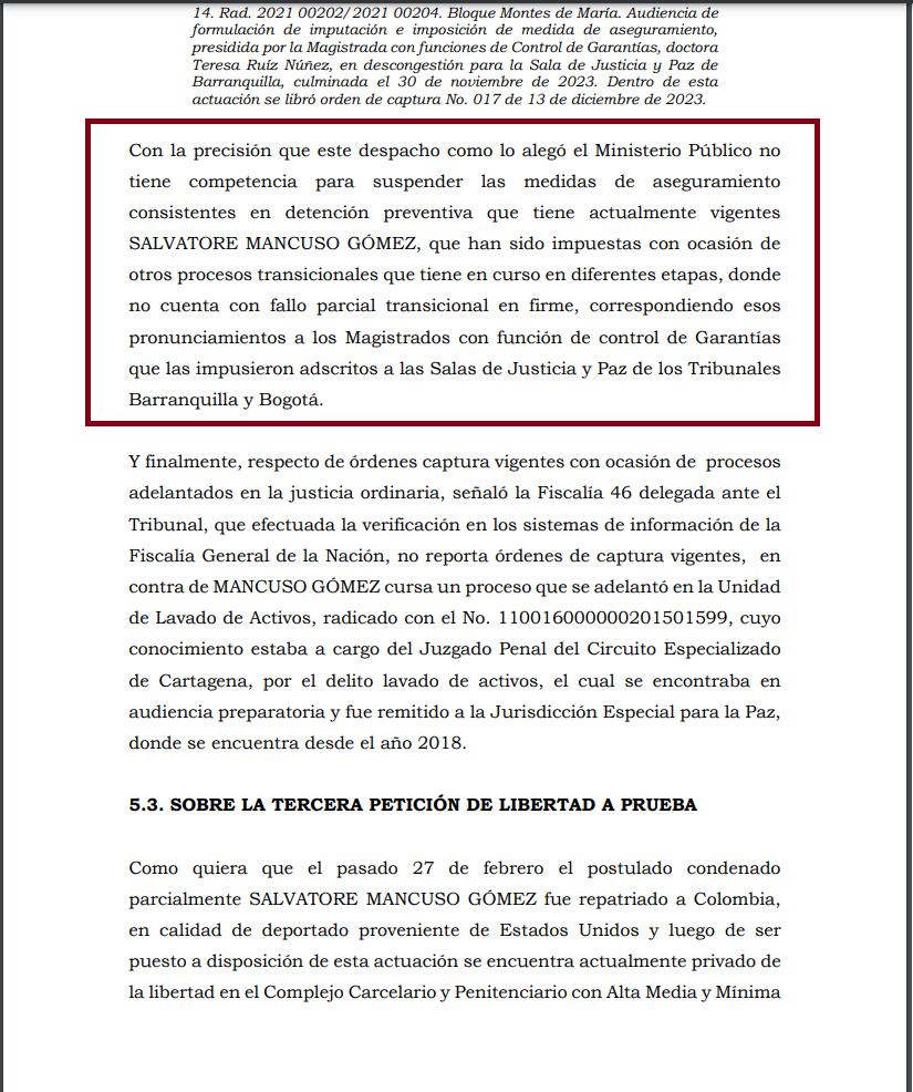 A partir de hoy, Mancuso queda a disposición de un magistrado con función de Control de Garantías de la Sala de Justicia y Paz del Tribunal de Barranquilla. La razón, actualmente tiene 33 órdenes de captura con medida de aseguramiento vigentes, expedidas por esa sala.