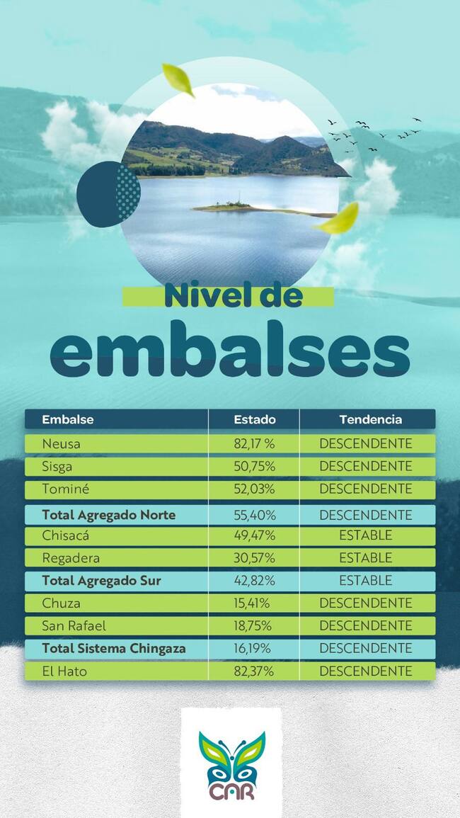 Según el último reporte de la Corporación Autónoma Regional de Cundinamarca (CAR), dos de los tres embalses del Agregado Norte (Neusa, Sisga y Tominé) presentan un promedio total de almacenamiento de 55,4 %, mientras que los del Agregado Sur (Chisacá y La Regadera) se encuentran estables con 42,8 % de su capacidad.
