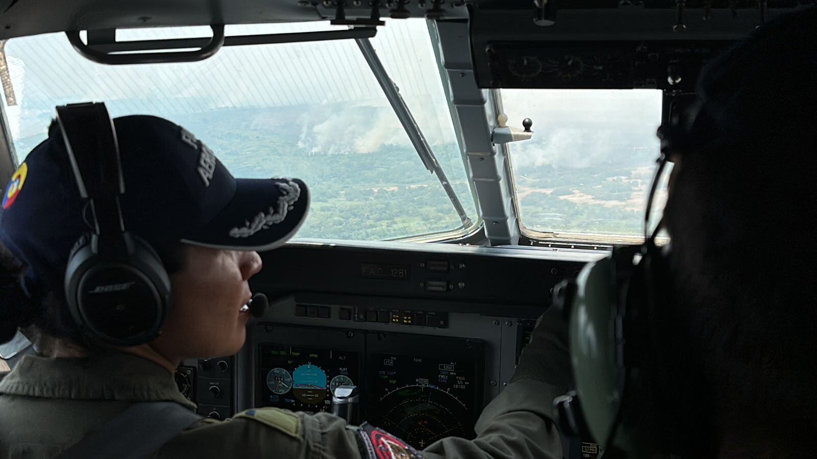 El general Celis destacó la cooperación internacional para utilizar por primera vez el sistema Guardian en Colombia. Es una operación complicada porque son aviones muy grandes, con baja altura y velocidad lanzando agua entre columnas de humo.