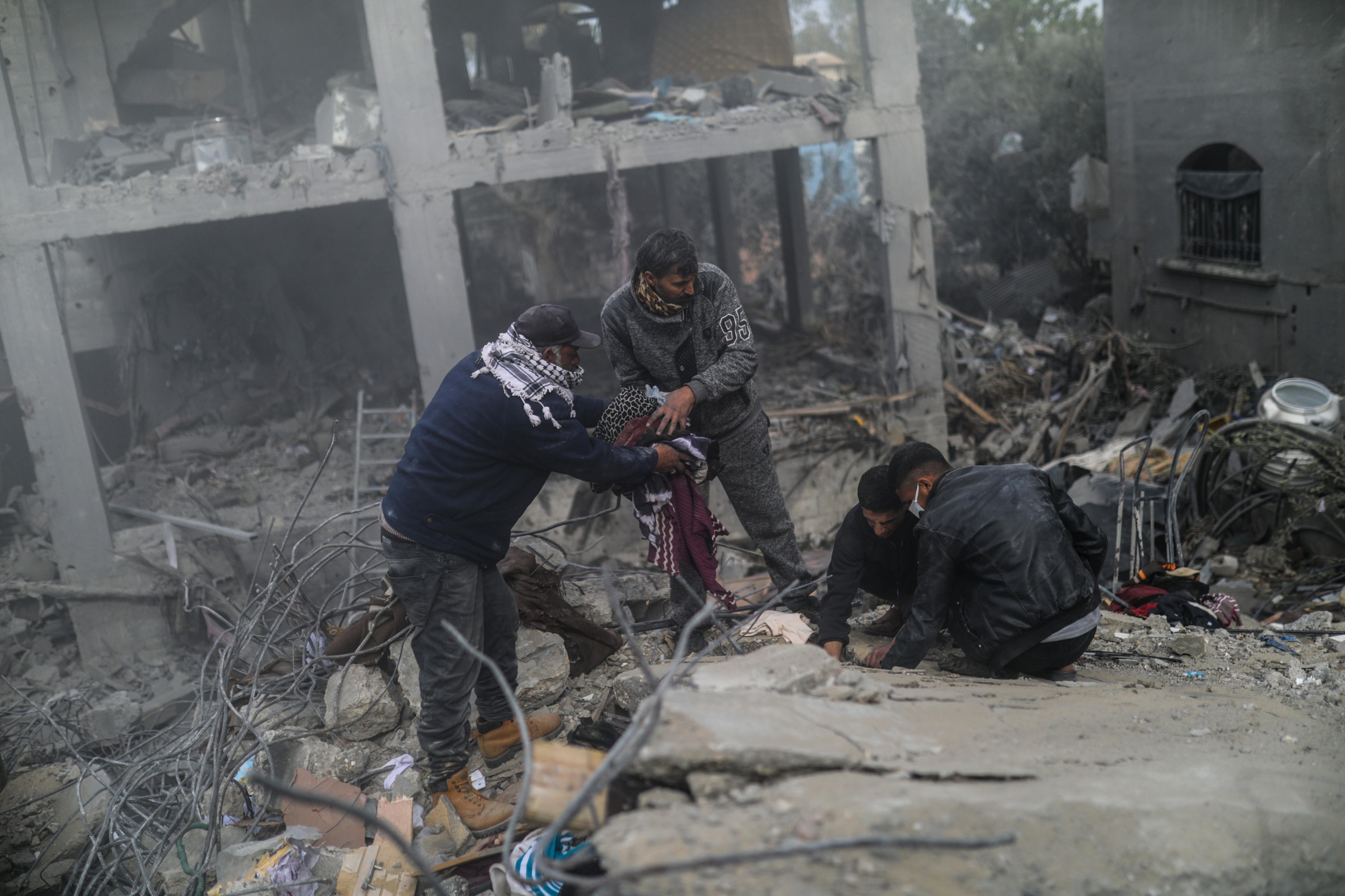 -FOTODELDIA- Deir Al Balah (---), 23/02/2024.- Palestinos buscan cuerpos y supervivientes entre los escombros de una casa destruida tras un ataque aéreo israelí en Deir Al Balah, sur de la Franja de Gaza, este 23 de febrero de 2024. EFE/MOHAMMED SABER / MOHAMMED SABER