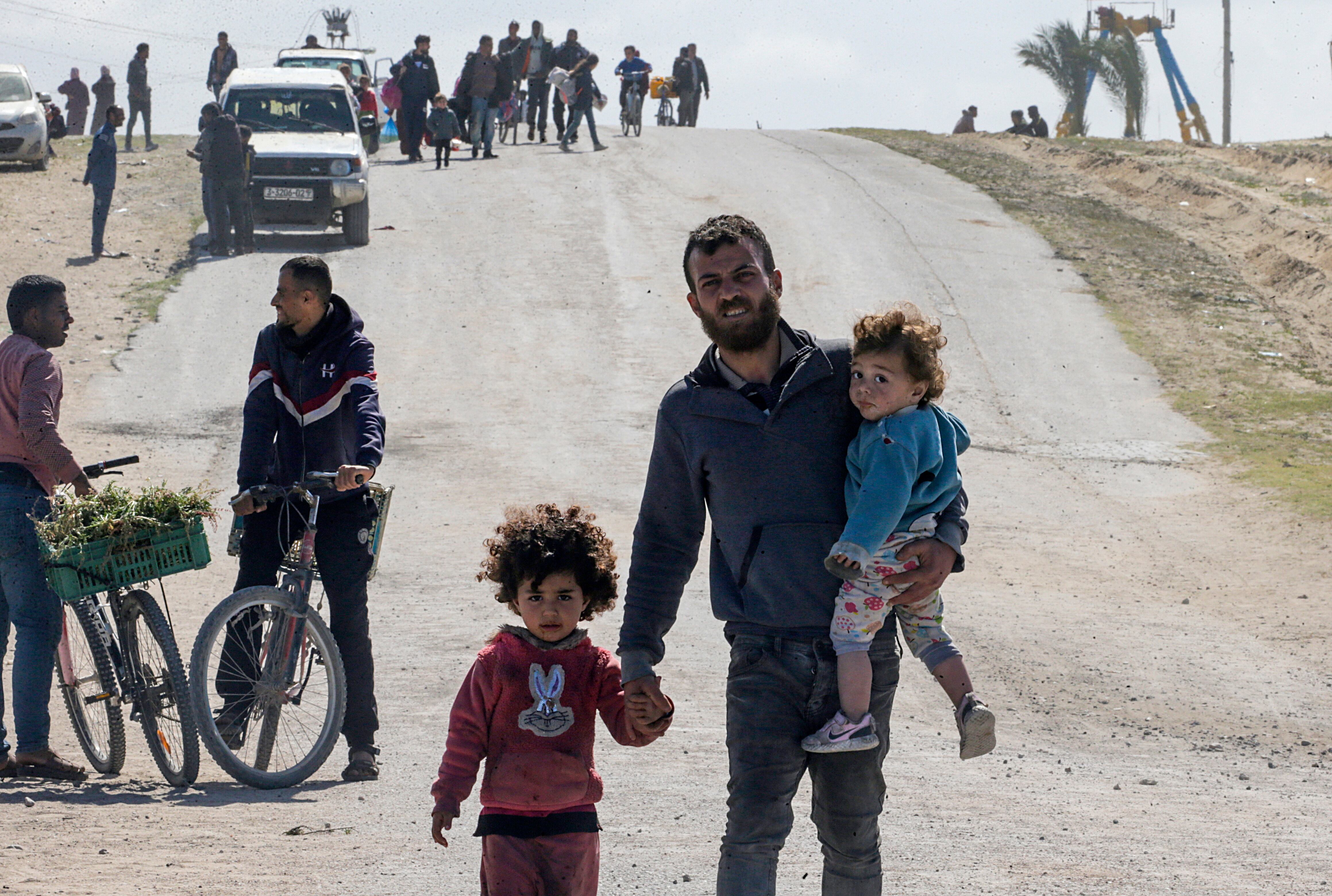 Khan Yunis (-), 04/03/2024.- Internally displaced Palestinians walk after the Israeli army told residents of the Hamad area in Khan Yunis to leave their homes and head towards Rafah, near the border with Egypt, southern Gaza Strip, 04 March 2024. The Israeli military stated on 04 March that a humanitarian evacuation corridor was established to allow civilians to exit the area. More than 30,500 Palestinians and over 1,300 Israelis have been killed, according to the Palestinian Health Ministry and the Israel Defense Forces (IDF), since Hamas militants launched an attack against Israel from the Gaza Strip on 07 October 2023, and the Israeli operations in Gaza and the West Bank which followed it. The Israeli military stated on 04 March that in recent days its forces launched an operation aimed at 'circling the west' in Khan Yunis, carrying out a series of strikes on dozens of targets from the 'air and the ground'. (Egipto) EFE/EPA/MOHAMMED SABER / MOHAMMED SABER