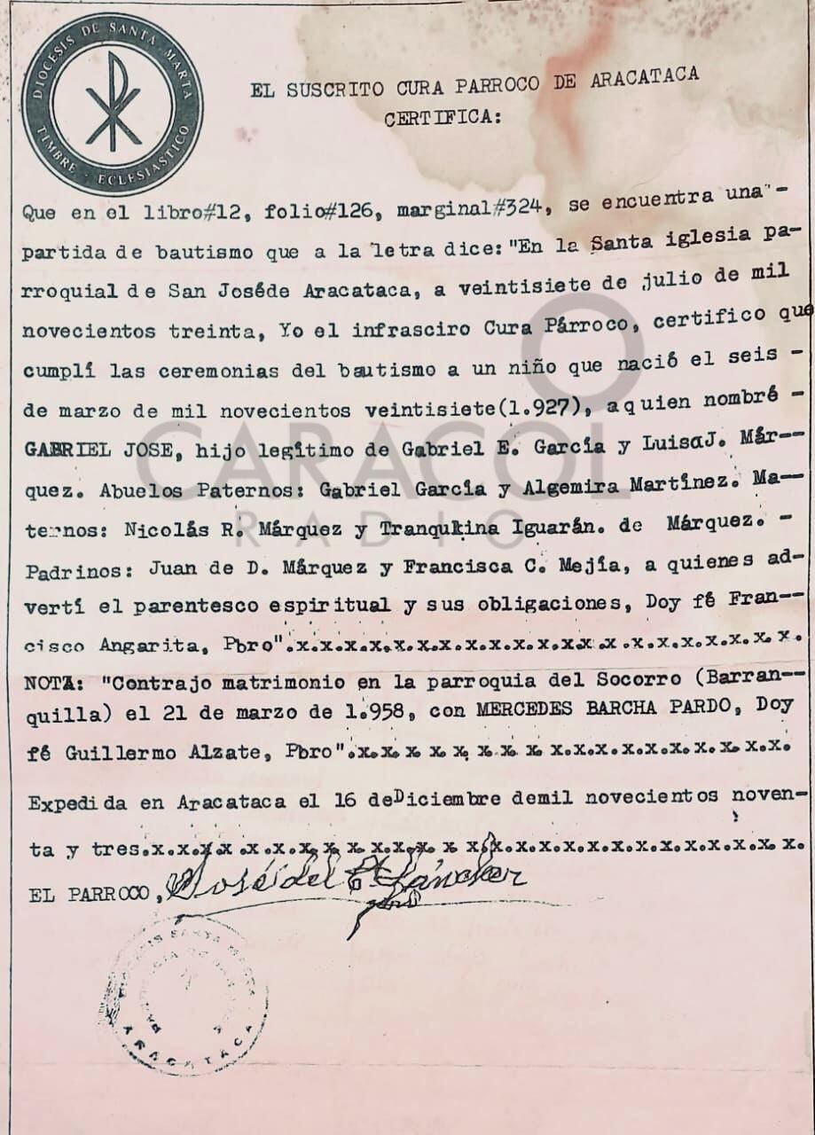 Encontramos la partida de bautismo de ‘Gabo’ en su natal Aracataca