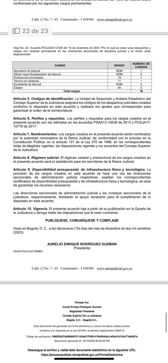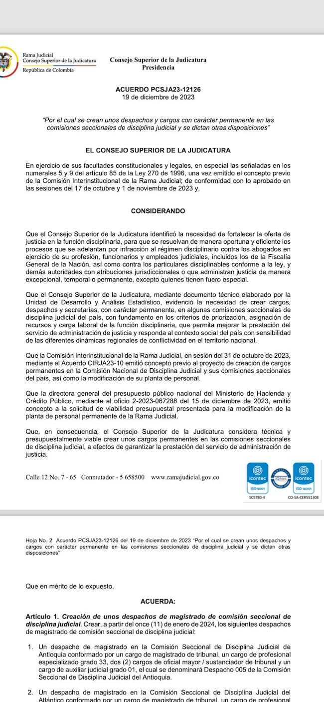 “Para lo cual el Ministerio de Hacienda ha sido generoso y nos ha colaborado, el proceso se ha venido consolidando en la creación de cargos permanentes en comisiones como Caquetá, Casanare, Chocó, Cundinamarca, Quintín, Rizalda, que se han producido en los años 2021, 2022, y 2023, pero específicamente a finales del año pasado, y es por lo que tú me preguntas, se hizo ya una comisión nacional”, señaló el magistrado.