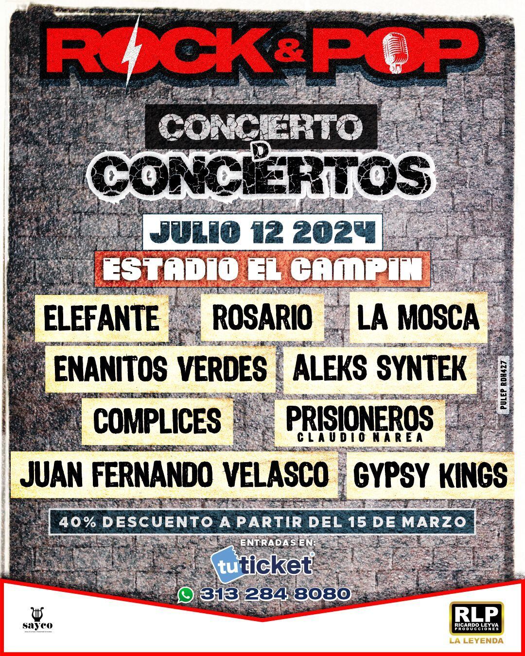 Un evento que ha dejado huella y se ha convertido en un símbolo para los habitantes de la capital. CONCIERTO DE CONCIERTOS, ¡Rock y Pop en Vivo! contará con la participación de Elefante, Rosario, La Mosca, Enanitos Verdes, Juan Fernando Velasco, Gypsy Kings, Prisioneros, Cómplices y Aleks Syntek.