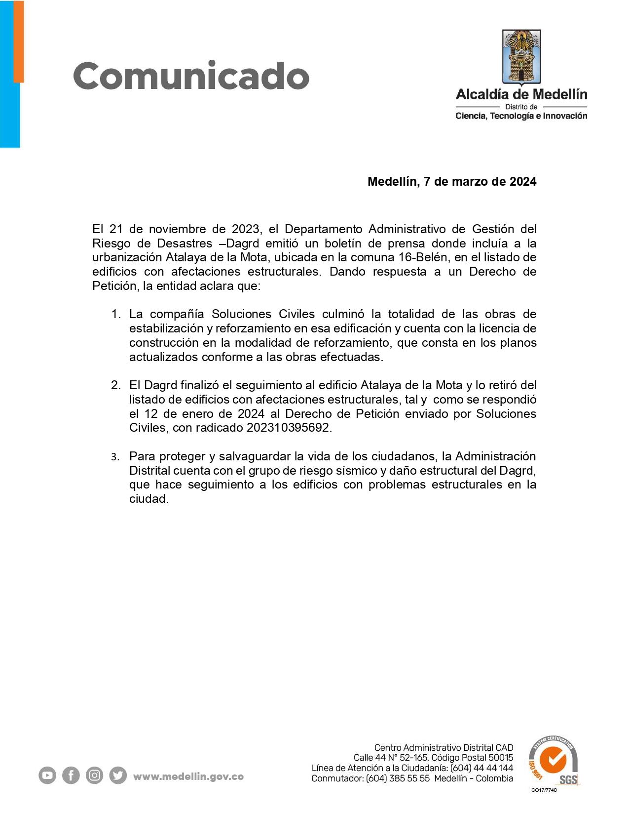 El Departamento Administrativo de Gestión del Riesgo de Desastres de Medellín (Dagrd) informó que luego de que se realizara las labores de reforzamiento al edificio Atalaya de la Mota ubicado en la comuna de Belén, lo sacó de la lista de edificaciones con problemas estructurales de la ciudad.