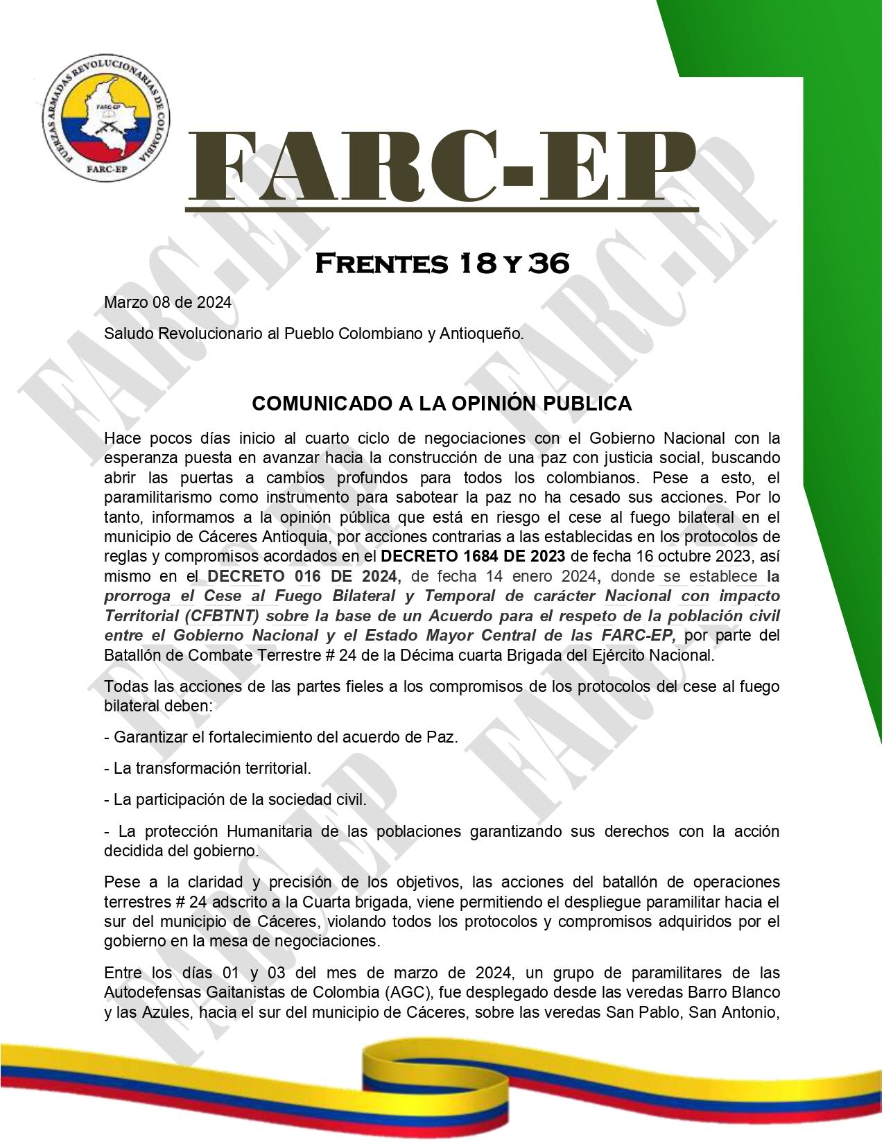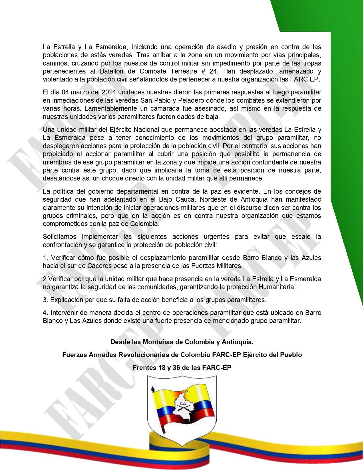 Aseguran que continúan dispuestos a seguir dialogando para lograr una paz, cuestionan el accionar, específicamente del ejército en las veredas Las Azules y Barro Blanco en Tarazá que presuntamente estaría permitiendo el despliegue de las antiguas AGC ahora autodenominadas EGC hacia el sur del municipio de Cáceres específicamente a las veredas San Pablo, San Antonio, La Estrella y La Esmeralda, a donde estaría dirigiendo su accionar el grupo ilegal donde supuestamente estarían señalando a la comunidad de ser colaboradores de los grupos guerrilleros, esto habría ocurrido entre el 01 y 03 de marzo. Situación que según los frentes 18 y 36 está poniendo en riesgo a las comunidades rurales “Pese a la claridad y precisión de los objetivos, las acciones del batallón de operaciones terrestres # 24 adscrito a la Cuarta brigada, viene permitiendo el despliegue paramilitar hacia el sur del municipio de Cáceres, violando todos los protocolos y compromisos adquiridos por el gobierno en la mesa de negociaciones”, dice uno de los párrafos del comunicado.