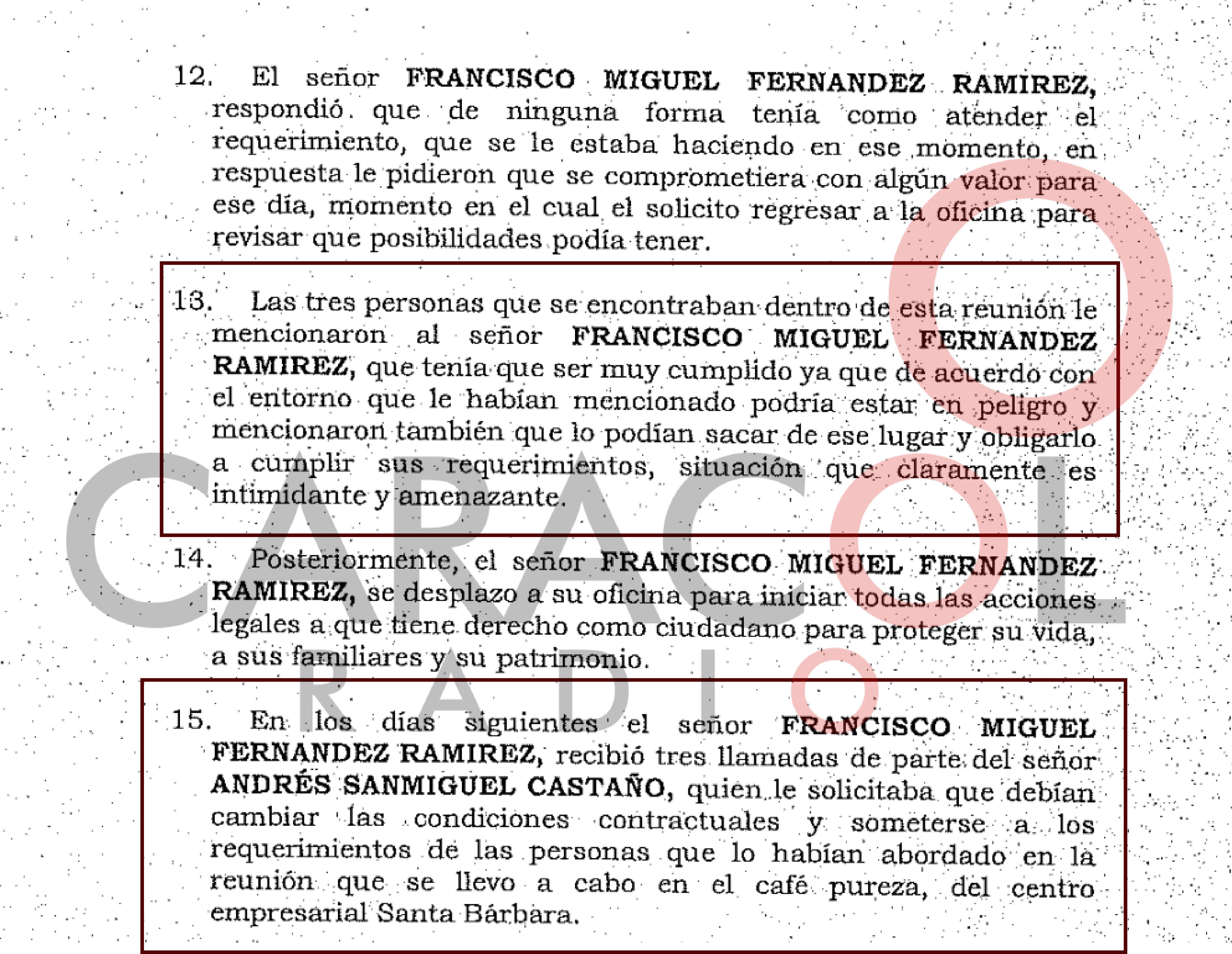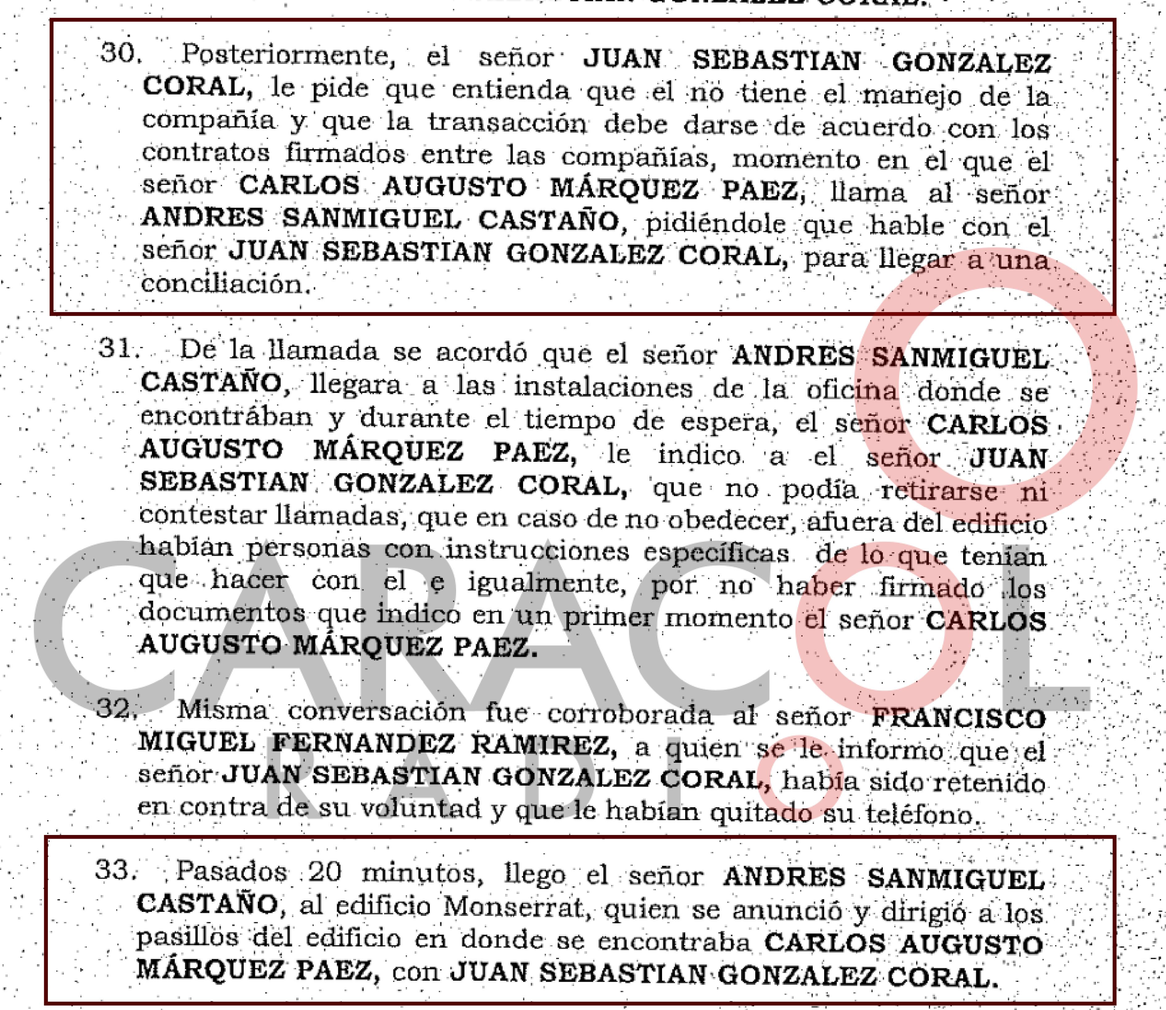El caso ya está en indagación, y según se lee en el documento, todo surgió el 28 de abril de 2023 cuando se realizó una reunión propuesta por Andrés Sanmiguel, en el café Pureza en el complejo empresarial de Santa Bárbara.