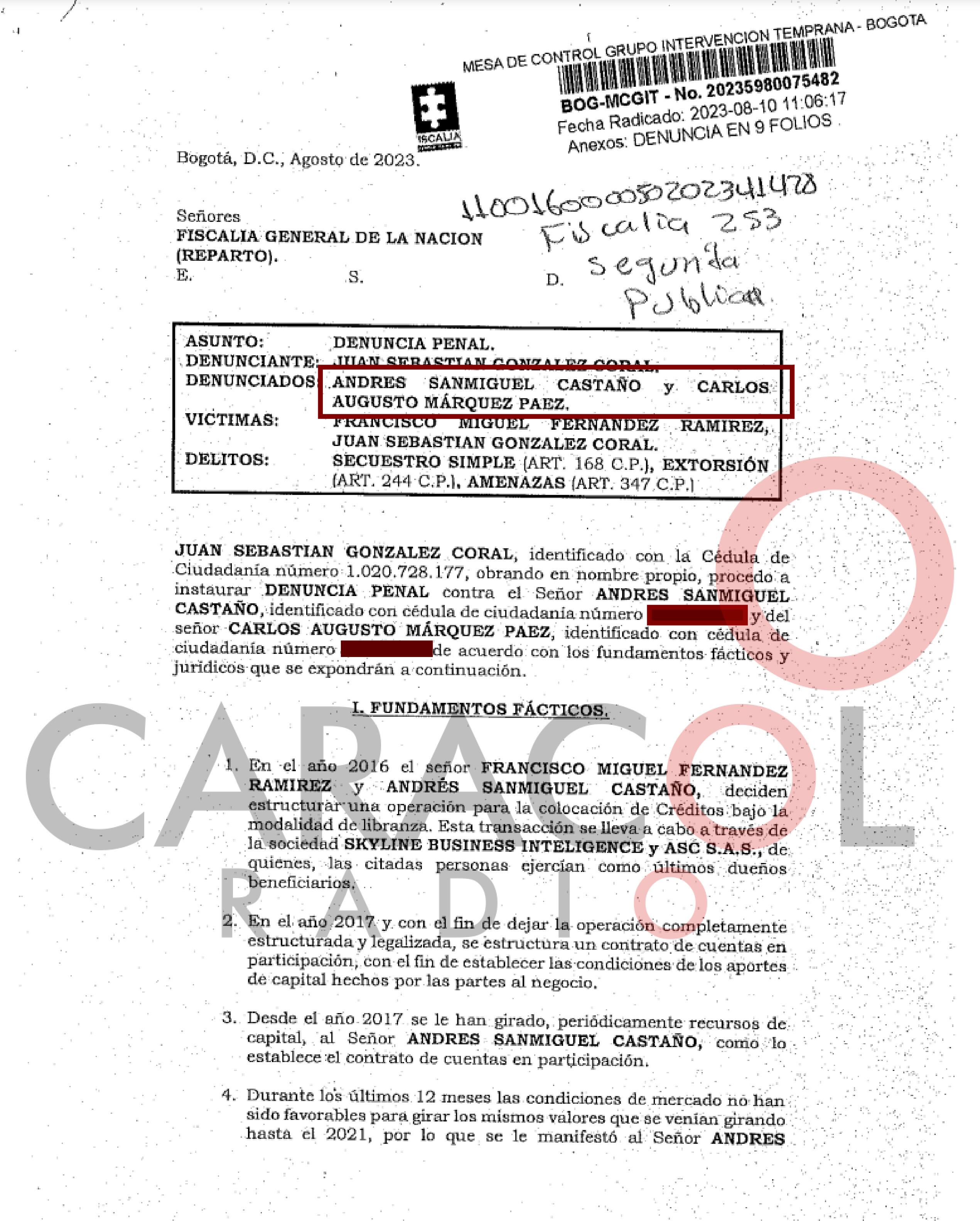 La denuncia conocida por Caracol Radio dice que Andrés Sanmiguel Castaño, presuntamente habría enviado sicarios para presionar a dos de sus socios para que le engtreguen $1.000 millones.
